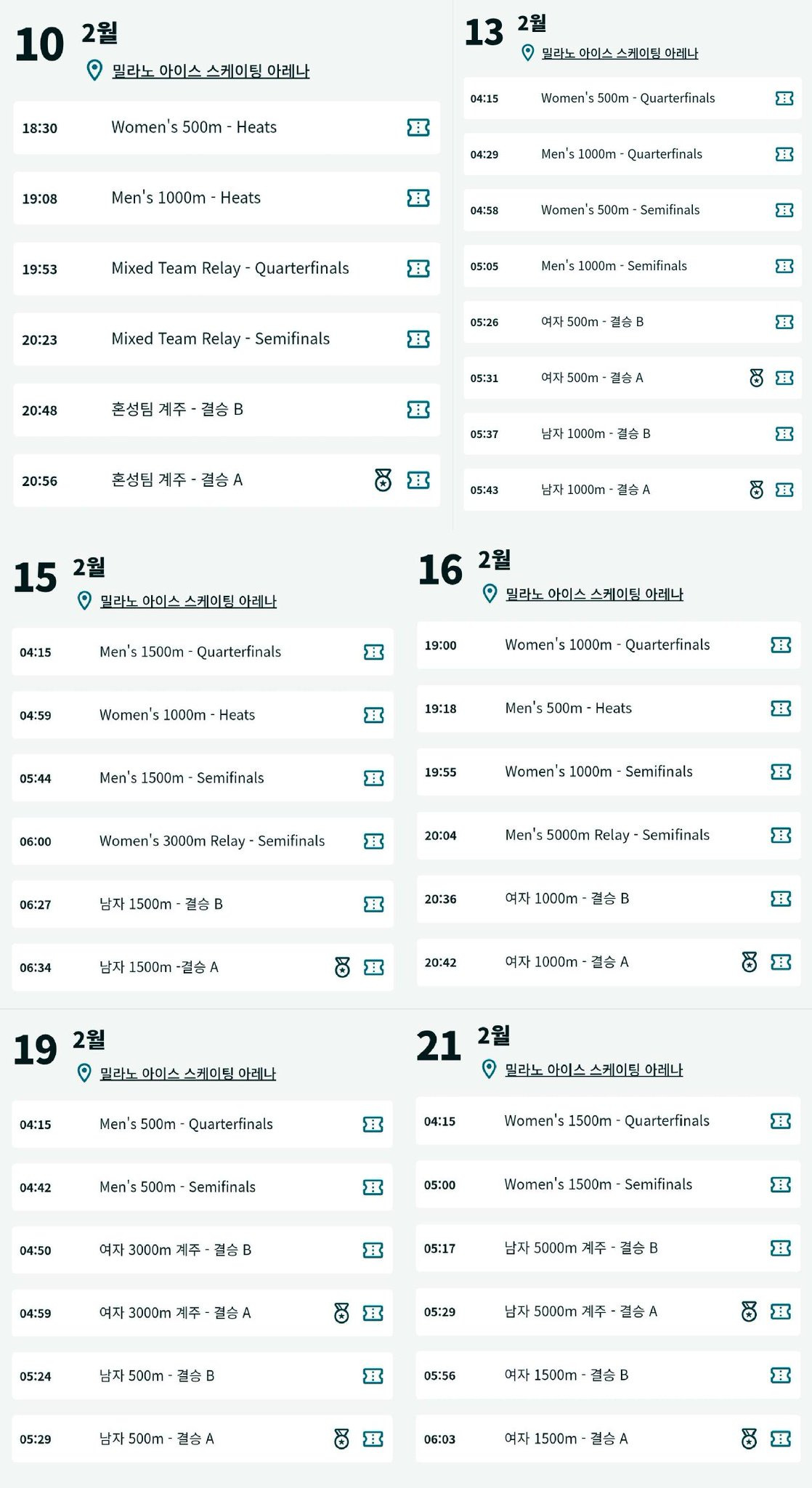 종목별 시간 정리표를 피겨하고 쇼트트랙만 찾아서,