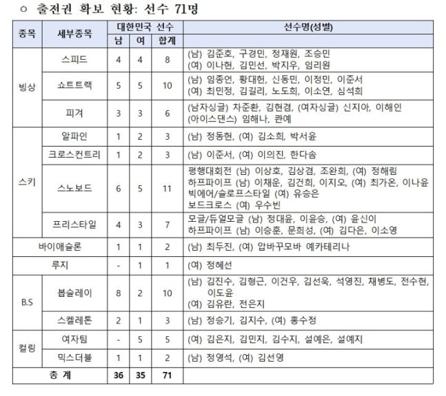 총 출전 선수는 71명