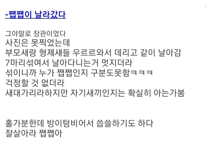 [스크랩] [흥미돋]둥지에서 버려진 제비 구조한 후기🪺 작성자춘구마|작성시간26.02.06|조회수6,564 목록 댓글 17 글자크기 작게가 글자크기 크게가 출처 : https://theqoo.net/square/3324368585?filter_mode=hot&page=2더쿠 - 둥지에서 버려진 제비 구조한 후기🪺여기를 눌러 링크를 확인하세요theqoo.net 다음검색 스크랩 원문 : 樂soccer 현재 게시글 추가 기능 열기 북마크 공유하기 신고 센터로 신고 댓글 댓글 17 댓글쓰기 답글쓰기 댓글 리스트 작성자암냠먐콘 | 작성시간 26.02.06 눈물난다... 쨉쨉아 행복해 작성자싶핥언제관두냐 | 작성시간 26.02.06 쨉쨉아 행복하렴글쓴 사람 복받을거임 작성자상어왕 | 작성시간 26.02.06 사랑으로 길렀으니 쨉쨉이는 몇 배로 행복할거야ㅠㅠㅠ 작성자영앤리치치리뱅뱡 | 작성시간 26.02.07 나도 한 번만 주워보고싶다 ㅎ 작성자마밀라피나타파이 | 작성시간 26.02.07 ㅠㅠㅠㅠㅠ 눈물나네.. 쨉쨉이도 글쓴이를 영원히 기억할거에요 댓글 전체보기