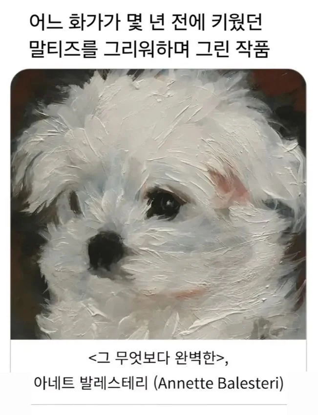 [스크랩] [흥미돋]어느 화가가 몇 년 전 키웠던 말티즈를 그리워하며 그린 작품 작성자누룩곰팡이|작성시간26.02.06|조회수24,749 목록 댓글 17 글자크기 작게가 글자크기 크게가 출처: https://www.dmitory.com/issue/385224866 다음검색 스크랩 원문 : *여성시대* 차분한 20대들의 알흠다운 공간 현재 게시글 추가 기능 열기 북마크 공유하기 신고 센터로 신고 댓글 댓글 17 댓글쓰기 답글쓰기 댓글 리스트 작성자tree | 작성시간 26.02.06 ㅠㅠㅠㅠ 작성자상어왕 | 작성시간 26.02.06 사랑으로 바라본 아가다.. 작성자프로스트 | 작성시간 26.02.06 애정이 느껴지는 그림이다 ㅠㅠ 작성자뿔버셧 | 작성시간 26.02.06 그무엇보다 완벽하구나 작성자98년도에는요 | 작성시간 26.02.06 귀여워미쳐버리겠터 댓글 전체보기