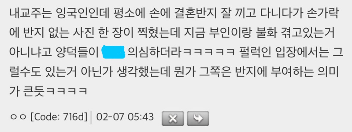 작성자라이언거슬림 작성시간 26.02.06 바람필 때마다 빼던데 허벌반지 아닌감