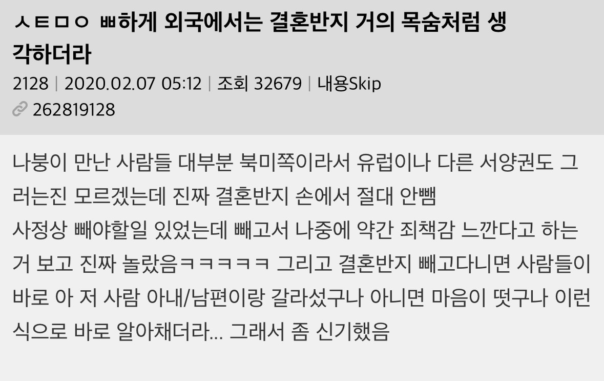 외국에서는 결혼반지 제대로 안 끼는 걸로 이혼하는 경우도 종종 있다고 함