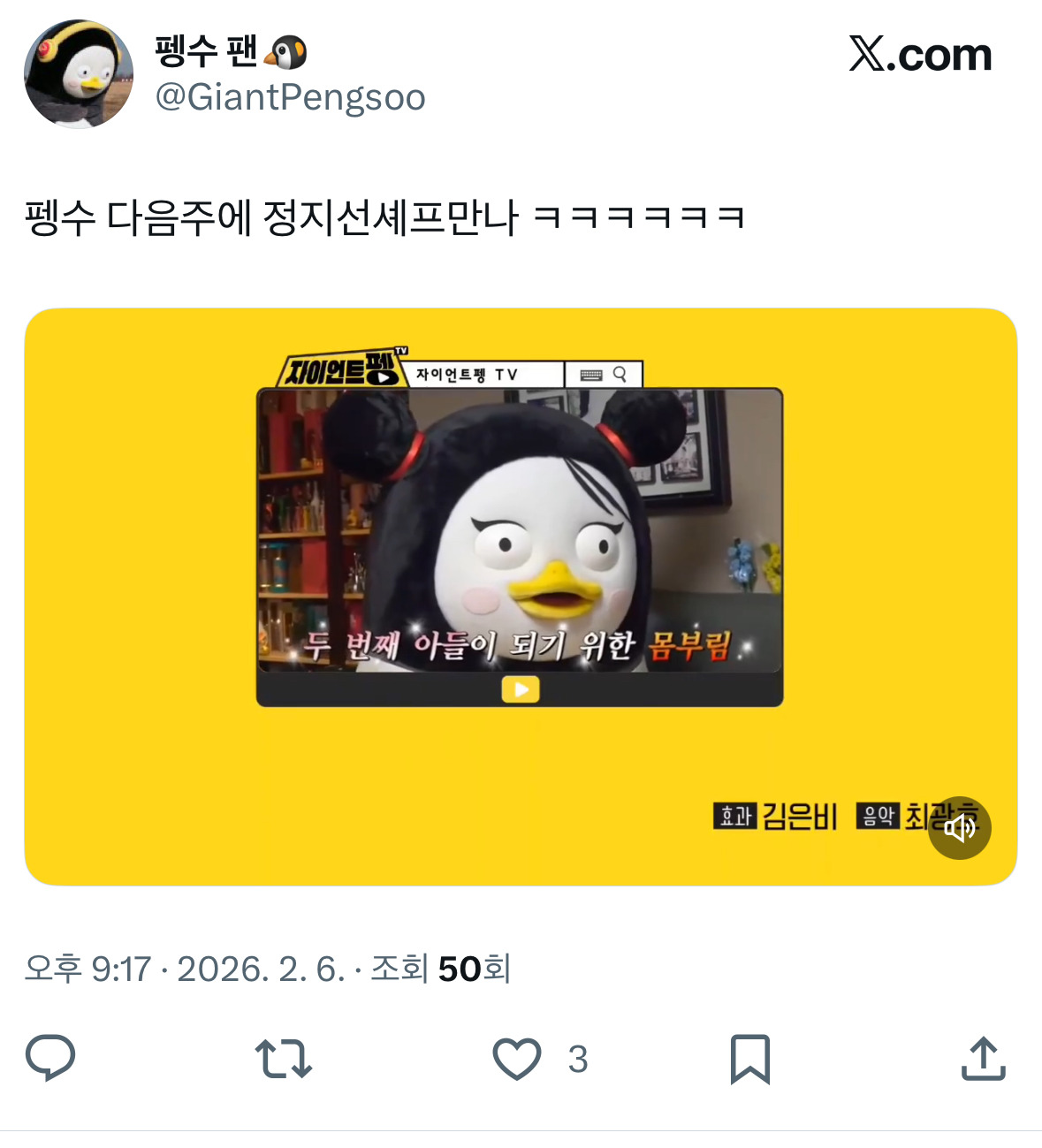 [흥미돋]정지선셰프 만난다고 뿌까머리 한 펭수 작성자오가닉제품|작성시간26.02.06|조회수32,086 목록 댓글 23 글자크기 작게가 글자크기 크게가 출처: https://theqoo.net/square/4086642246뿌까머리 한알이 사실상 셰프님 얼굴크기 ㅋㅋㅋhttps://x.com/i/status/2019747207797264496X의 펭수 팬🐧님(@GiantPengsoo)펭수 다음주에 정지선셰프만나 ㅋㅋㅋㅋㅋㅋx.com 다음검색 현재 게시글 추가 기능 열기 북마크 공유하기 신고 센터로 신고 댓글 댓글 23 댓글쓰기 답글쓰기 댓글 리스트 작성자98년도에는요 | 작성시간 26.02.06 와 진짜 닮음 ㅋㅋㅋㅋㅋ 작성자뿌링뿌힝클 | 작성시간 26.02.07 진짜귀엽다 ㅋㅋ 작성자아포칼립스에 물류센터를 숨김 | 작성시간 26.02.07 아이라인ㅋㅋㅋㅋㅋ 작성자빵빠래 | 작성시간 26.02.07 아이라인 그리니깐 사백안이 너무 도드라져 ㅋㅋㅋㅋㅋㅋㅋㅋㅋ 작성자햄스터꼬리곰탕 | 작성시간 26.02.07 아이라인ㅋㅋㅋㅋ 댓글 전체보기