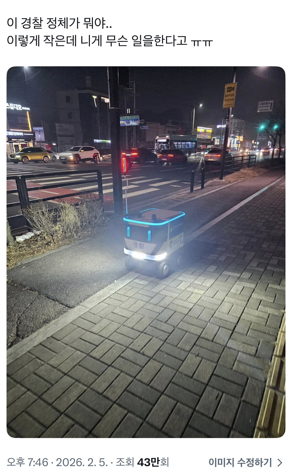 [흥미돋]순찰중인 경찰 로봇 작성자Rooose|작성시간26.02.06|조회수16,166 목록 댓글 26 글자크기 작게가 글자크기 크게가 출처: https://x.com/ych_res2tory/status/2019361990628766038?s=46&t=49r3Kw6TNqvpiTF8J4JDaA 다음검색 현재 게시글 추가 기능 열기 북마크 공유하기 신고 센터로 신고 댓글 댓글 26 댓글쓰기 답글쓰기 댓글 리스트 작성자당근바니풔 | 작성시간 26.02.07 째깐한게 뭘한다고! ㅠㅠㅠㅠ 작성자국산 브로커 | 작성시간 26.02.07 내가 지켜줘야될거같아ㅜ 작성자고양이과맹수 | 작성시간 26.02.07 로봇청소기같은 존재네! 작성자나소흑전기 | 작성시간 26.02.07 아 뭐지 방부 같다 작성자부찌머그러오세요 | 작성시간 26.02.07 요기요 아녔어? 언제 이직했니 댓글 전체보기