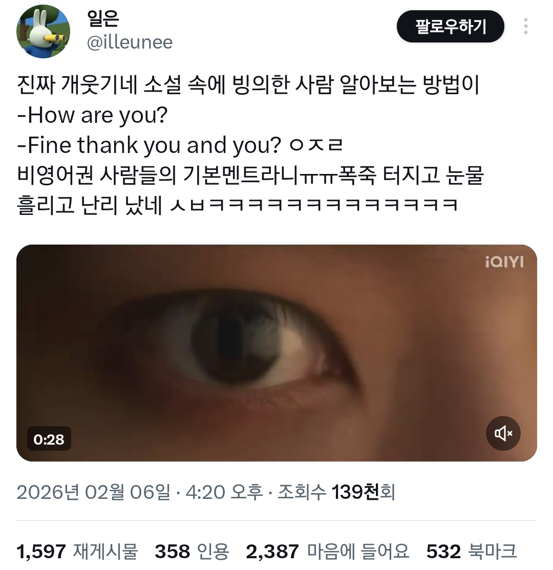 작성자김엿 작성시간 26.02.07 걍 비영어권 애들 공통인가봐ㅜㅜㅜㅜㅋㅋㅋ어학연수때 영어 진짜 못하는 터키애 았었는데 하와유 물어보명 아임파인땡큐앤유만 숨도 안쉬고 대답함