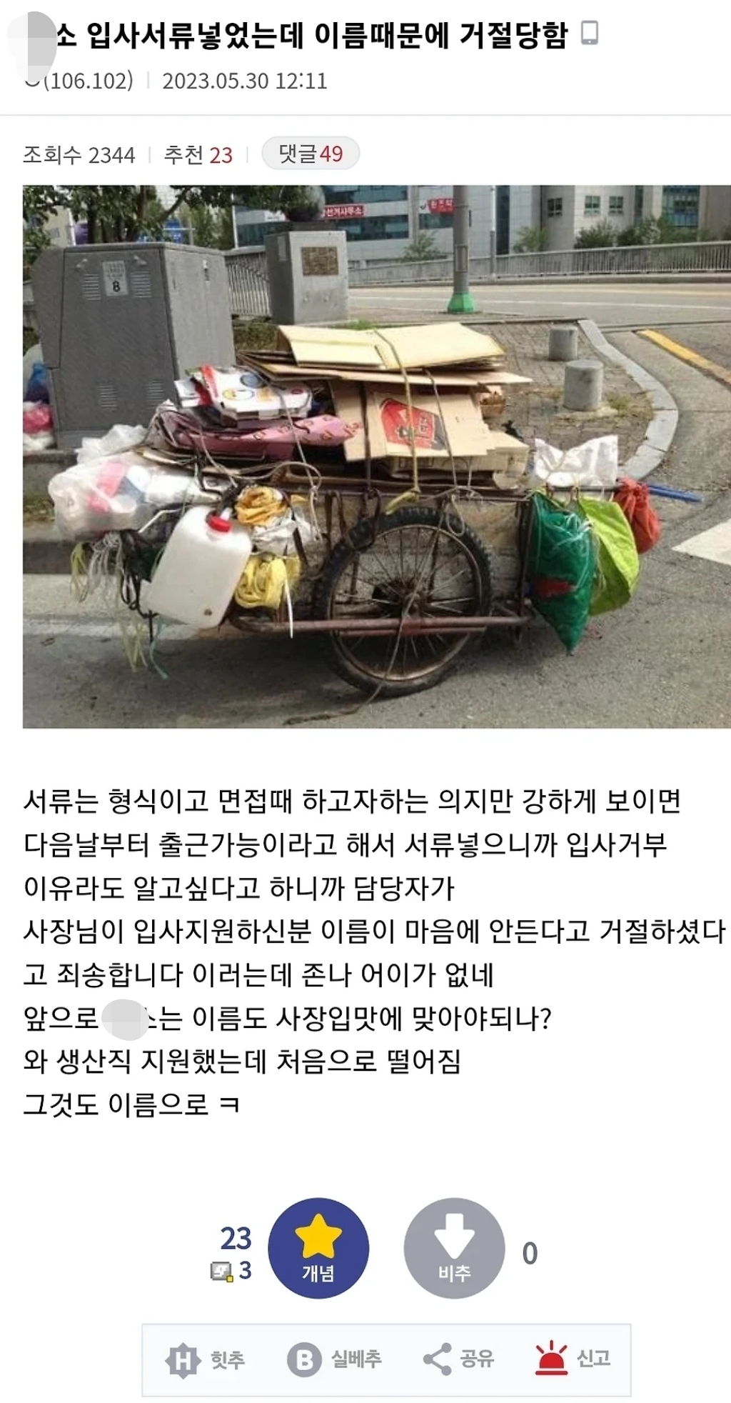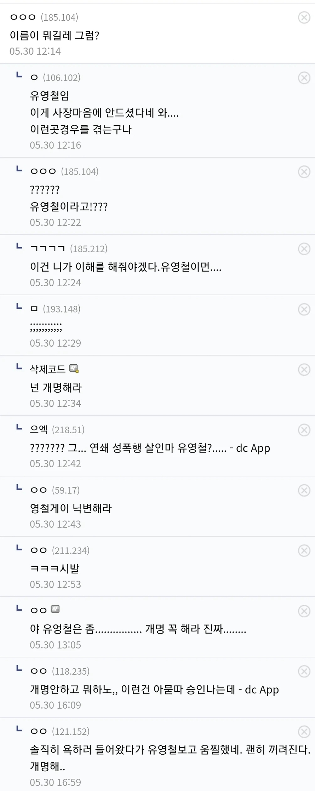 [흥미돋]중소 입사서류 넣었는데 이름때문에 입사거부당함 작성자계절 틈에 잠시 피는 낯선꽃처럼|작성시간26.02.06|조회수27,256 목록 댓글 69 글자크기 작게가 글자크기 크게가 출처: https://m.cafe.daum.net/subdued20club/ReHf/4503939?svc=cafeapp이름 때문에 좆소 입사 거절당한 디시인.jpg출처 : https://theqoo.net/2816131406이름 때문에 좆소 입사 거절당한 디시인.jpg - 스퀘어 카테고리여기를 눌러 링크를 확인하세요theqoo.netm.cafe.daum.net 다음검색 현재 게시글 추가 기능 열기 북마크 공유하기 신고 센터로 신고 댓글 댓글 69 댓글쓰기 답글쓰기 댓글 리스트 작성자햄스터꼬리곰탕 | 작성시간 26.02.07 아이고 빠른닉변 ㄱ 삭제된 댓글입니다. 답댓글 작성자미래를위한준비 | 작성시간 26.02.07 22ㅋㅋㅋㅋㅋㅋ 작성자귀뚜라미귀뚜라미 | 작성시간 26.02.07 딴 범죄자도 아니고 유영철인데 지금까지 안바꾼거보면 답나오지않음? 내가 사장이여도 안뽑을래 작성자대표님 | 작성시간 26.02.07 조두순 이름 가진 사람도 조두순 말곤.. 많지 않을걸 이제..? 저렇게까지 유지하는 고집이 찝찝해서 안 뽑을 것도 같음 댓글 전체보기