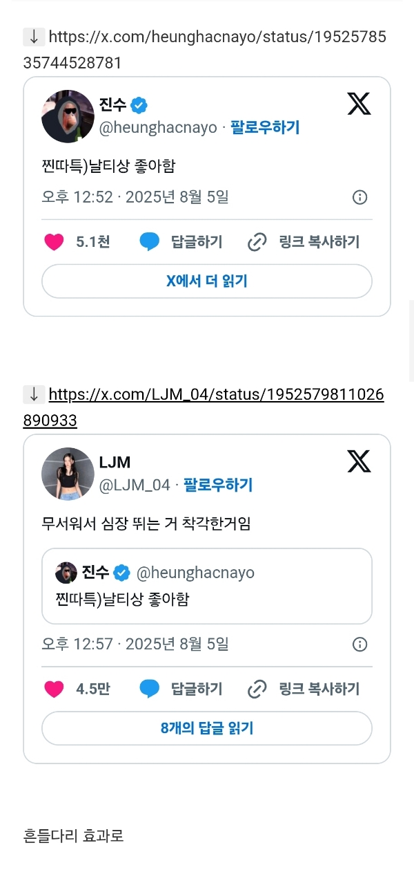 [스크랩] [흥미돋]찐따특)날티상 좋아함 작성자나무기차|작성시간26.02.07|조회수59,617 목록 댓글 35 글자크기 작게가 글자크기 크게가 출처: 여성시대 (깍깍뚜루두)더쿠 다음검색 스크랩 원문 : *여성시대* 차분한 20대들의 알흠다운 공간 현재 게시글 추가 기능 열기 북마크 공유하기 신고 센터로 신고 댓글 댓글 35 댓글쓰기 답글쓰기 댓글 리스트 답댓글 작성자rorororlll | 작성시간 26.02.07 덩치랑 스타일링때문에 날티나보이는거같아 작성자rorororlll | 작성시간 26.02.07 어 이거 맞는거같아.. 최근에 느낌;; 작성자배수지941010 | 작성시간 26.02.07 어어 ㅁㅈㅁㅈ팩폭 날리지마 작성자오렌지에스프레소 | 작성시간 26.02.07 극복하지 못한 트라우마는 페티쉬가 된다 그건가 작성자머쨍이토마토 | 작성시간 26.02.07 어쩐지 ㅋㅌㅌㅋㅋㅋㅋㅋㅋ 댓글 전체보기