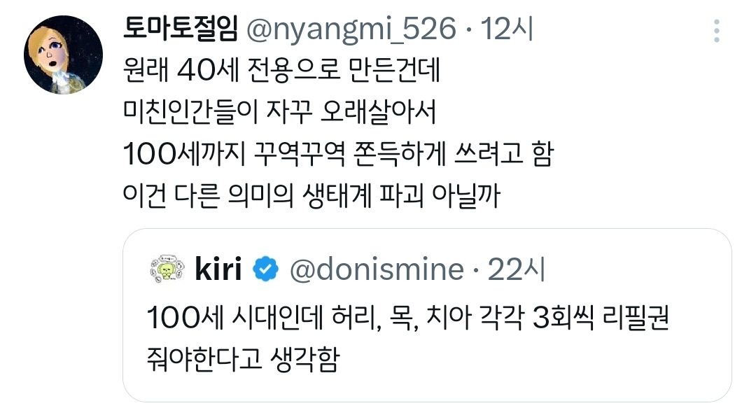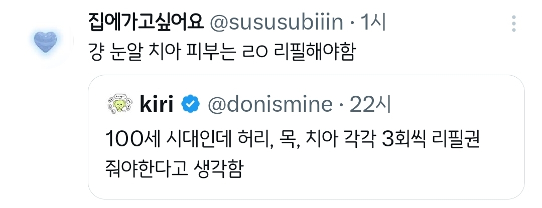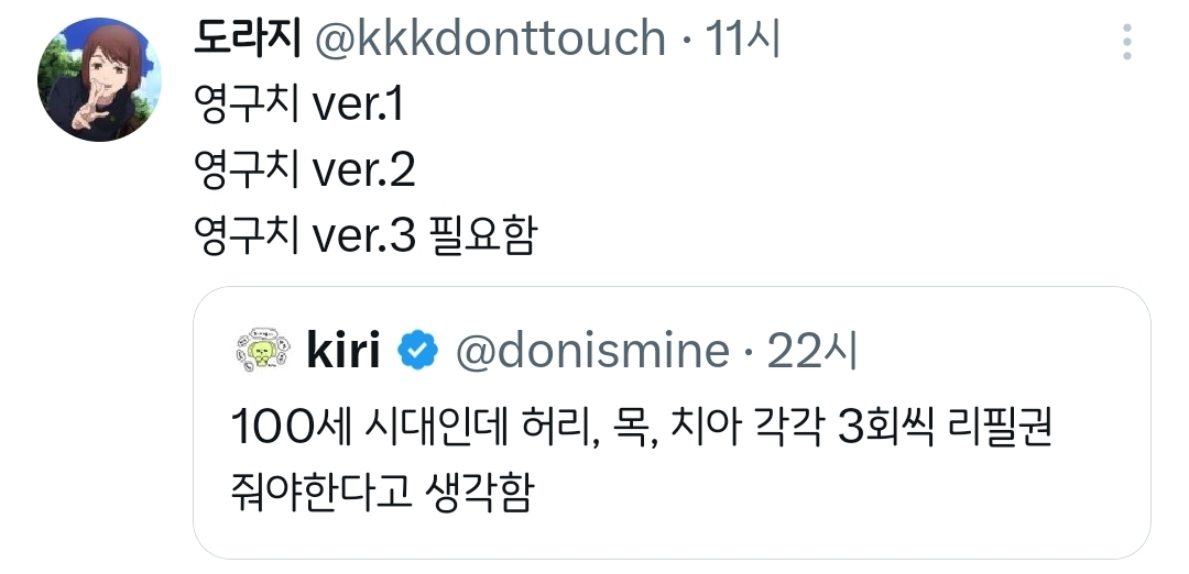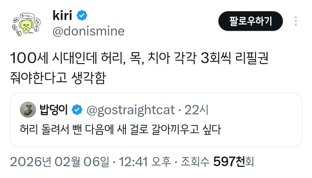 [흥미돋]허리, 목, 치아 각각 3회씩 리필권 줘야한다고 생각함.twt 작성자치킨바냐나|작성시간26.02.07|조회수38,291 목록 댓글 201 글자크기 작게가 글자크기 크게가 출처: 여성시대 치킨바냐나https://x.com/i/status/2019617372647399754X의 kiri님(@donismine)100세 시대인데 허리, 목, 치아 각각 3회씩 리필권 줘야한다고 생각함x.com 다음검색 현재 게시글 추가 기능 열기 북마크 공유하기 신고 센터로 신고 댓글 댓글 201 댓글쓰기 답글쓰기 댓글 리스트 작성자뵤오오 | 작성시간 26.02.08 딱 하나 고르라면 치아요 제발요 작성자짱워녕 | 작성시간 26.02.08 한번만이라도 다시 리셋하게 해죠요;;; ㅜ 난 제발 무릎.... 연골.... 작성자도파미네랄 | 작성시간 26.02.08 무릎도.. 작성자두오링고 | 작성시간 26.02.08 허리 치아 제발.. 작성자후라보노뭘보노 | 작성시간 26.02.09 눈이랑 관절들 다 댓글 전체보기
