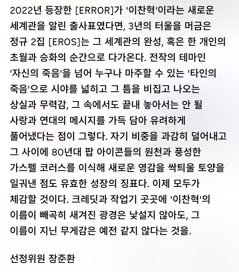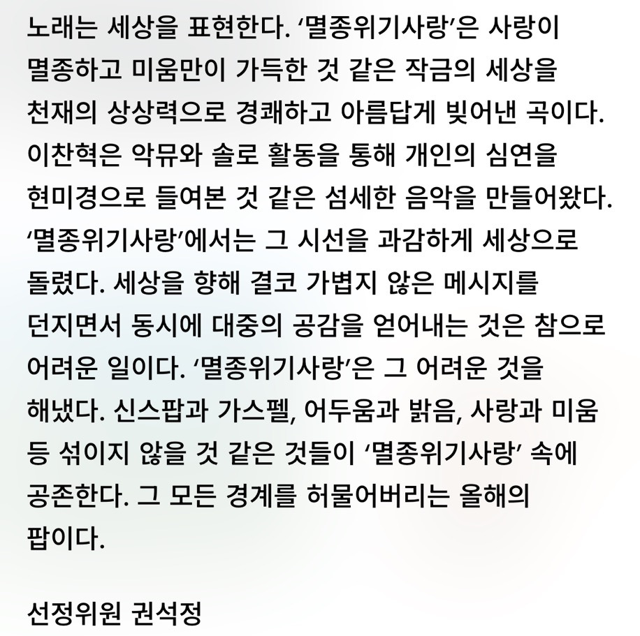 답댓글 작성자Marinser 작성자 본인 여부 작성자 작성시간 26.02.07 ㄴㄴ 제목이 대상 최다 노미라고 되어있음 우희준은 대상 1개 부문 올해의 음악인만 후보 나머지는 대상부문 아님