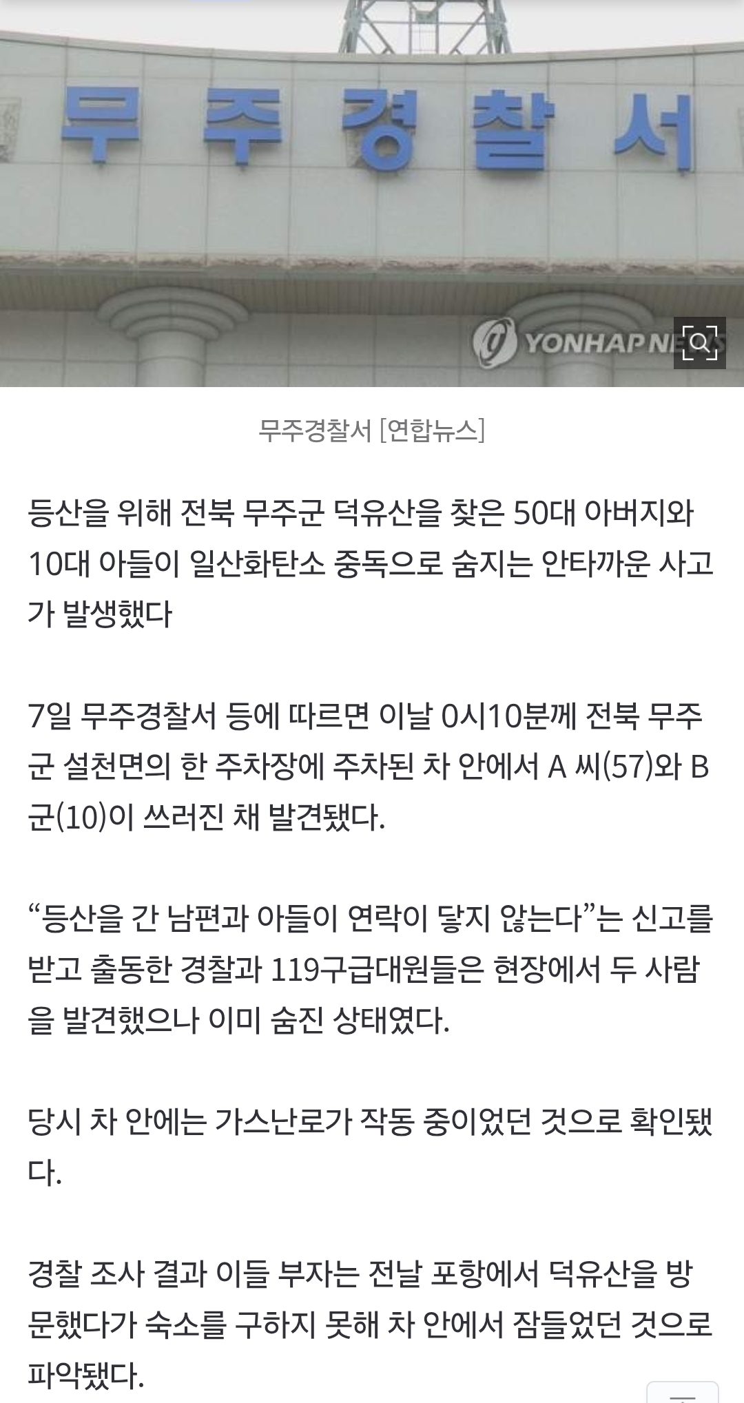 [여시뉴스데스크]등산하러 덕유산 찾은 50대 아버지·10살 아들…주차 차량서 숨진채 발견 작성자onxinw|작성시간26.02.07|조회수61,231 목록 댓글 89 글자크기 작게가 글자크기 크게가 출처: https://naver.me/51u6GrSw등산하러 덕유산 찾은 50대 아버지·10살 아들…주차 차량서 숨진채 발견등산을 위해 전북 무주군 덕유산을 찾은 50대 아버지와 10대 아들이 일산화탄소 중독으로 숨지는 안타까운 사고가 발생했다 7일 무주경찰서 등에 따르면 이날 0시10분께 전북 무주군 설천면의 한 n.news.naver.com 다음검색 현재 게시글 추가 기능 열기 북마크 공유하기 신고 센터로 신고 댓글 댓글 89 댓글쓰기 답글쓰기 댓글 리스트 작성자Amoroso | 작성시간 26.02.07 헉 어쩌다가… 이게 무슨일이야… 작성자이강인(PSG) | 작성시간 26.02.08 삼가 고인의 명복을 빕니다 작성자고양이딸기 | 작성시간 26.02.08 삼가 고인의 명복을 빕니다 작성자꿀벌마야 | 작성시간 26.02.08 삼가 고인의 명복을 빕니다 작성자훗추추 | 작성시간 26.02.12 삼가 고인의 명복을 빕니다 댓글 전체보기