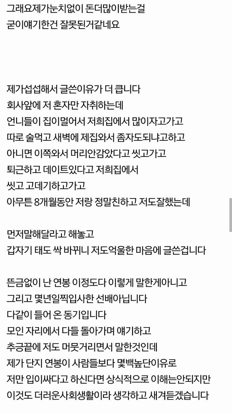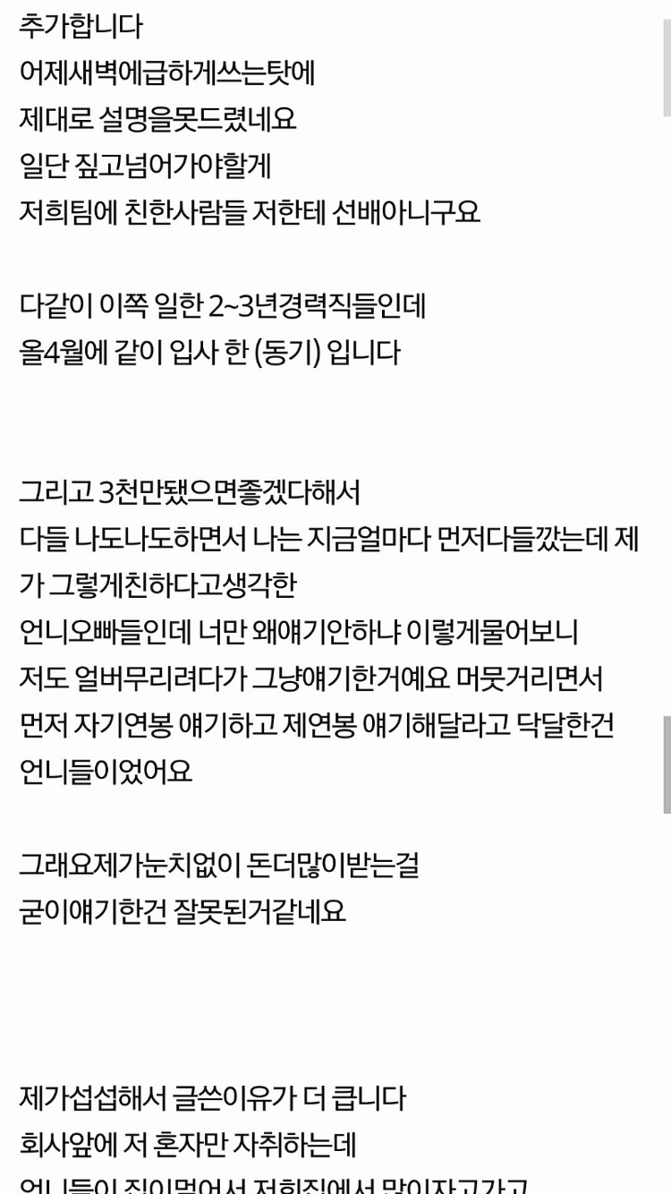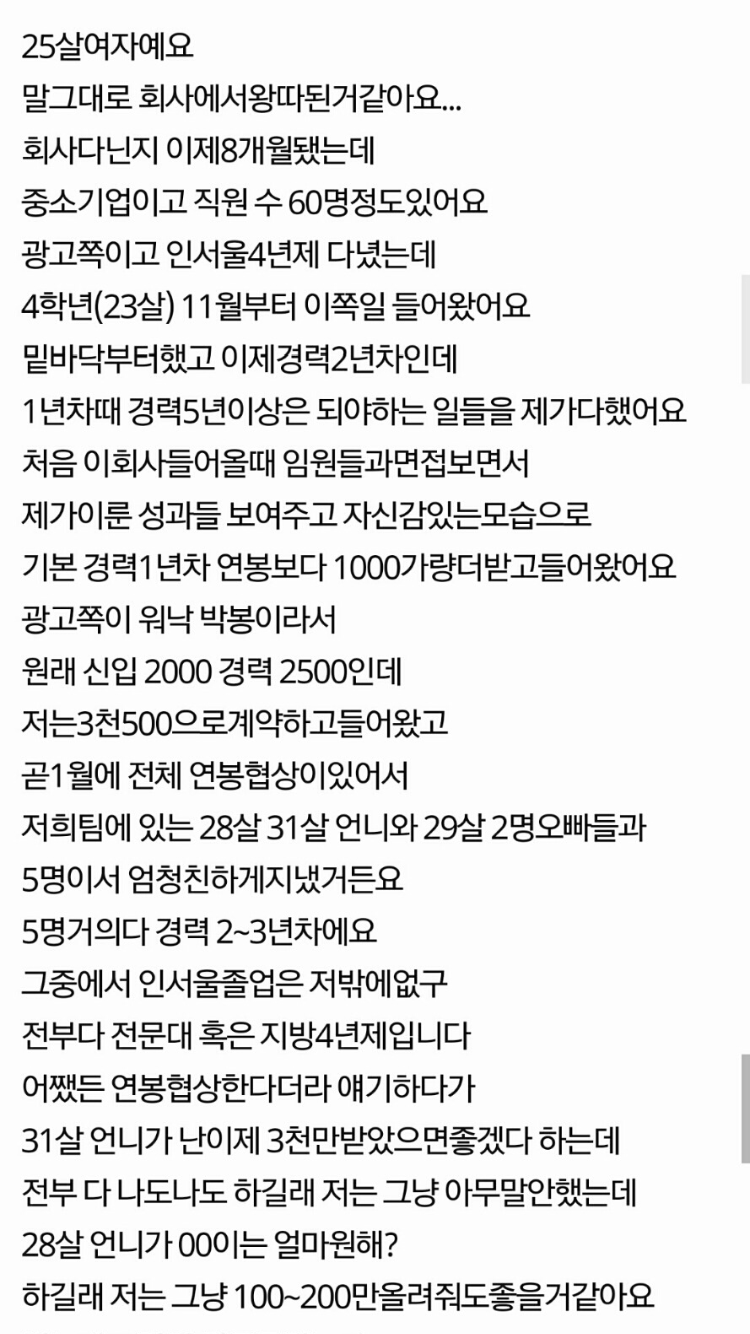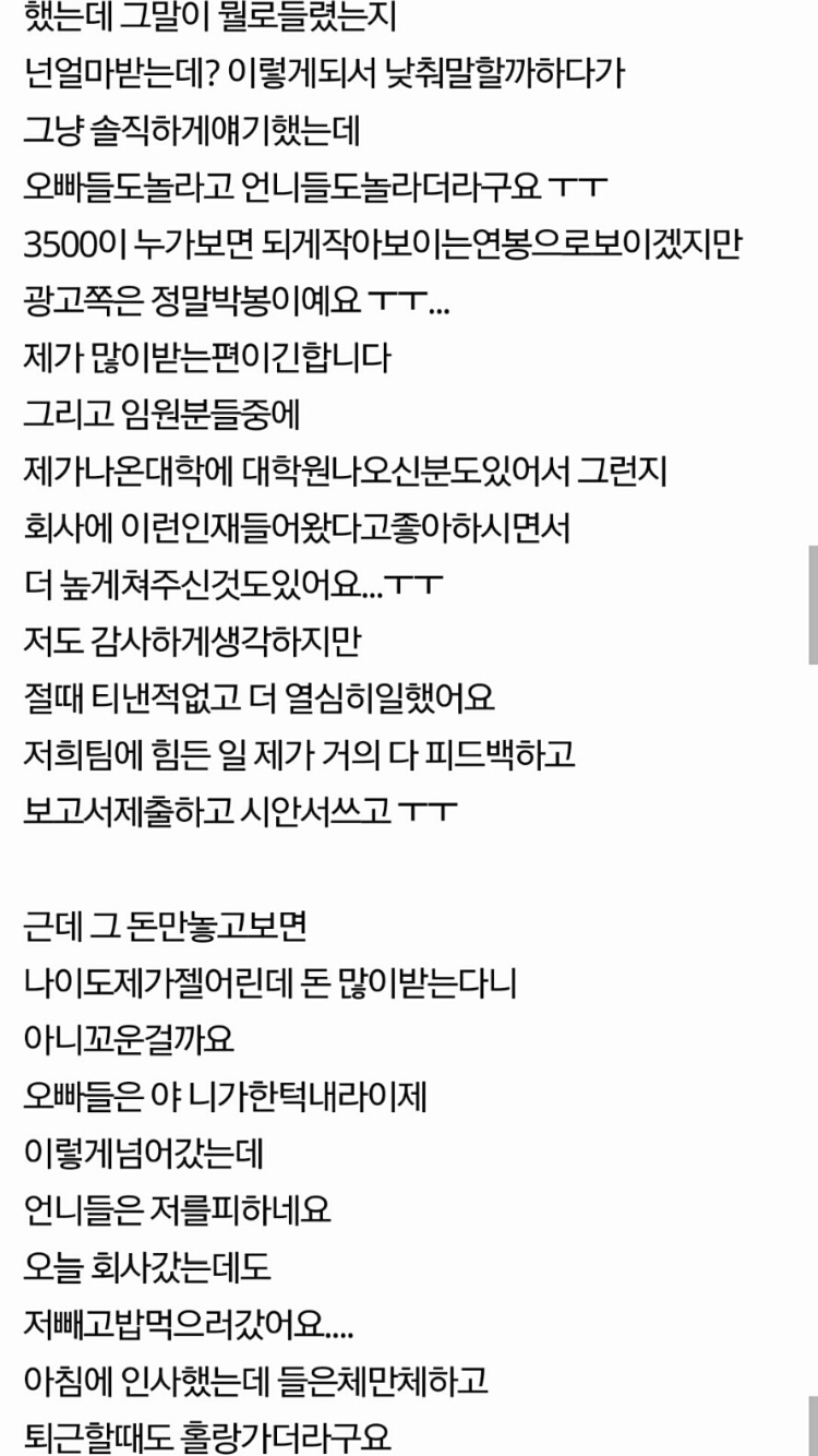 작성자경칩 작성시간 26.02.08 애초에 연봉 공개하게끔 판까는것 자체가 정상적인 사회생활이 아닌것같은데 직장사람들 뭐임..