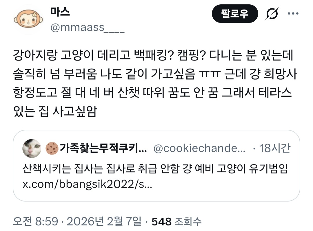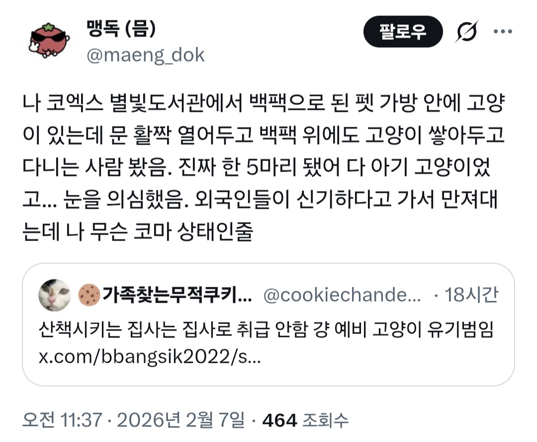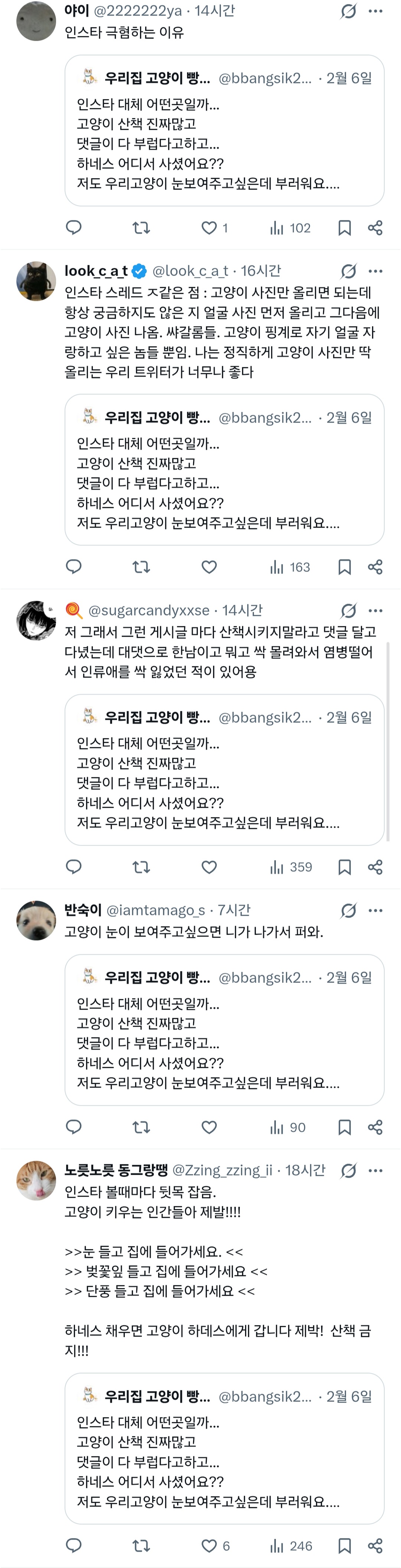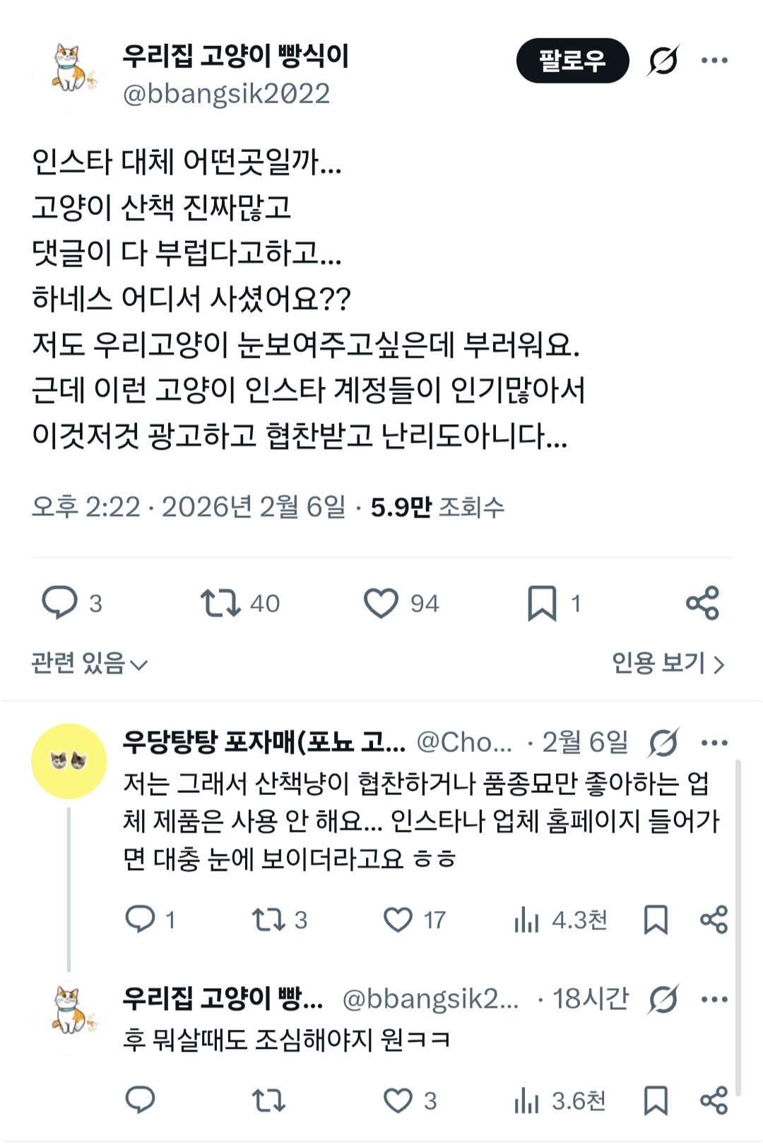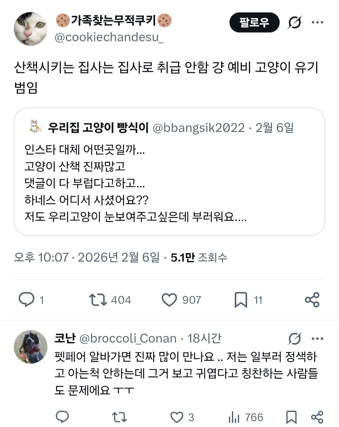 작성자아보카도좋아 작성시간 26.02.07 어떤 유투번지 블로건지 몇년동안 두마리 산책시키면서 (심지어 오프리쉬) 사람들한테 가르치는 투로 고양이도 교감 잘하면 오프리쉬로 산책도 가능하다고 자연에서 살아가는 종을 인간의 욕심으로 가둬놓고 키우는게 진정 그들의 행복을 위한거냐고 이럼서 호통치더니 결국 3번인가 잃어버리고 맨날 구독자들한테 찾아달라고 요청하고 전단지 돌리고 이러다가 결국 못찾은걸로 앎