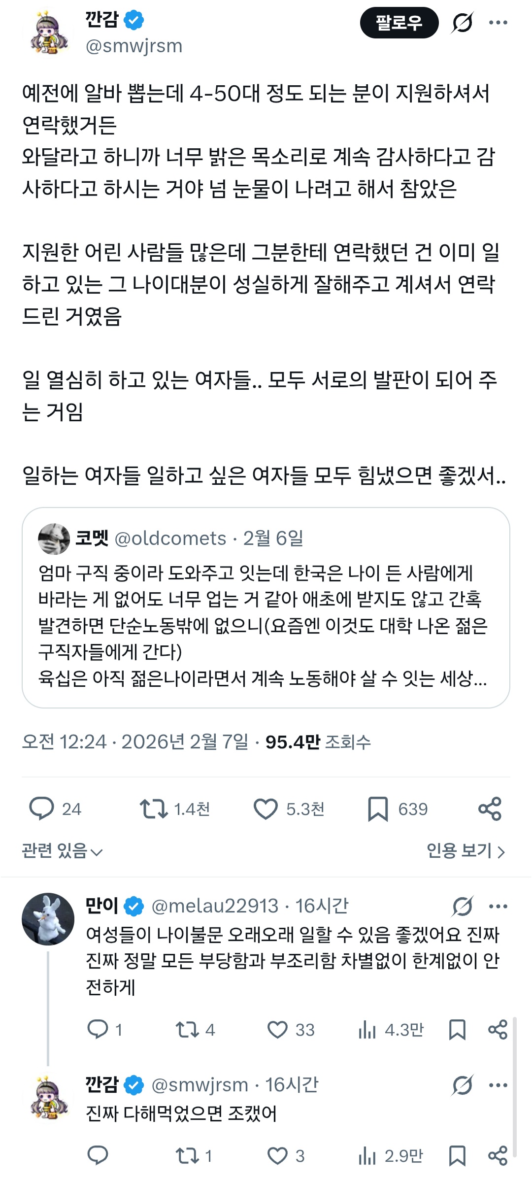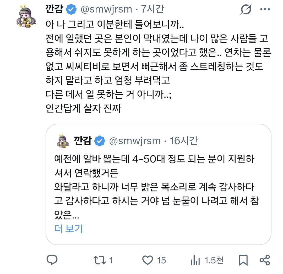 작성자뚝섬플레이스 작성시간 26.02.07 일해보면 알걸 ㅠㅠㅠ나이 있으신 분들이 더 말이 잘 통할 때가 있음