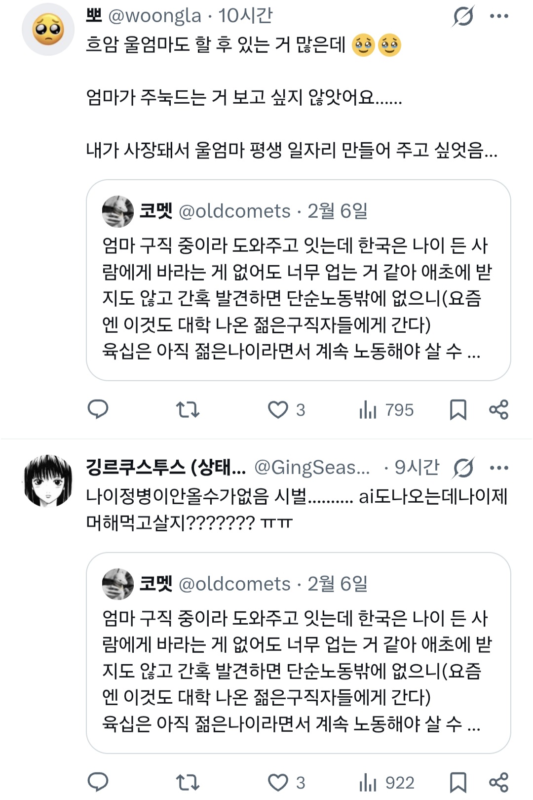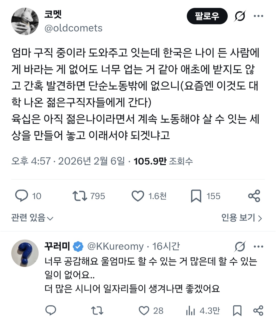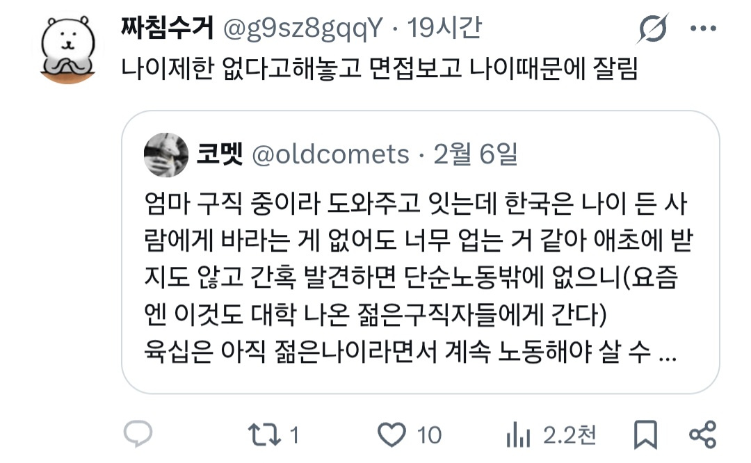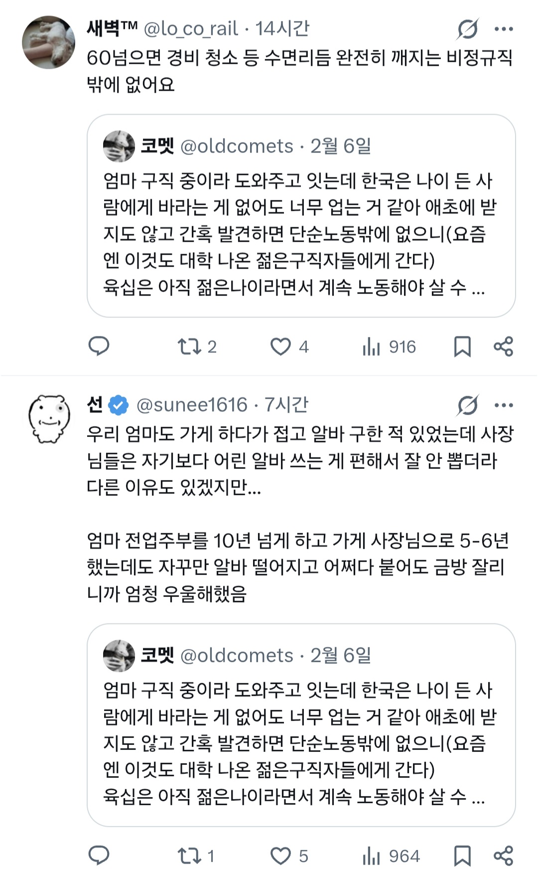 [기타]엄마 구직 중이라 도와주고 잇는데 한국은 나이 든 사람에게 바라는 게 없어도 너무 업는 거 같아 애초에 받지도 않고.twt