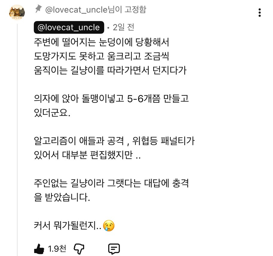 [스크랩] [기타]눈 속에 돌맹이 넣어서 길고양이한테 던지는 남초딩들 작성자nikee|작성시간26.02.08|조회수6,202 목록 댓글 71 글자크기 작게가 글자크기 크게가 https://youtube.com/shorts/HsOZJRkgSDA?si=wkog0JZm_u4_VMI3 다음검색 스크랩 원문 : 비공개카페 현재 게시글 추가 기능 열기 북마크 공유하기 신고 센터로 신고 댓글 댓글 71 댓글쓰기 답글쓰기 댓글 리스트 작성자컵뉴들 우동맛 | 작성시간 26.02.08 야 니들도 똑같이 당해봐니들보다 몇 배 큰 사람한테환멸나는 새끼들 작성자후라이의 꿈 | 작성시간 26.02.08 아 진짜 시팔 남자애들 관리좀 해라 부모들아 작성자해피바나나물범 | 작성시간 26.02.08 뒤져 진짜 한남새끼들아 작성자고양읻 | 작성시간 26.02.08 이 미친것들 똑같이 맞아야돼 진짜 작성자거지여시 | 작성시간 26.02.08 증말 혐오스러워~~ 부모까지도~~ 댓글 전체보기