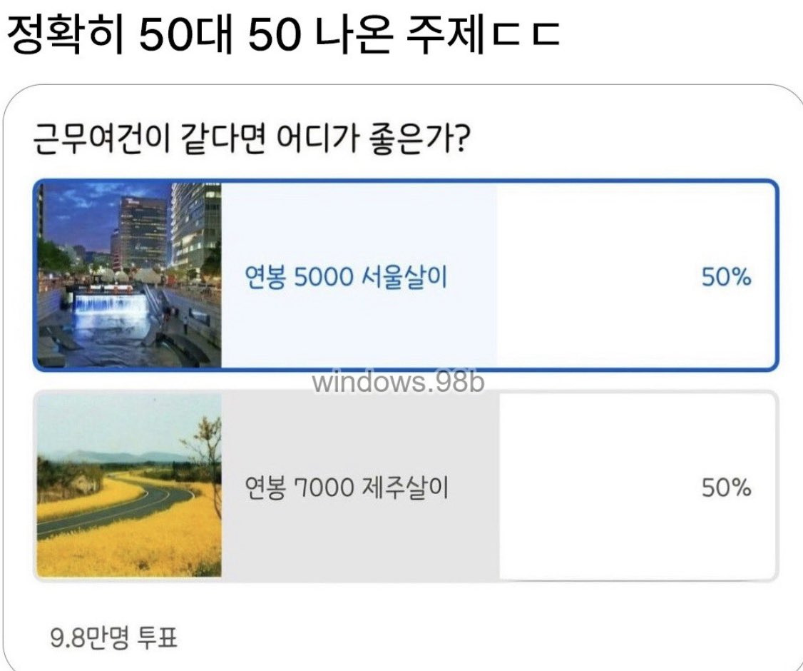[흥미돋]정확히 50 : 50 나온 주제 - 서울살이 vs 제주살이 작성자작고작은|작성시간26.02.08|조회수44,645 목록 댓글 283 글자크기 작게가 글자크기 크게가 출처: https://x.com/ceolmh3/status/2020139409207648437 고르면 앞으로 평생 다녀야하는 근무지는 어디?(노후에 가기 / 돈모으고 다른지역가기 그런거 없음) 다음검색 현재 게시글 추가 기능 열기 북마크 공유하기 신고 센터로 신고 댓글 댓글 283 댓글쓰기 답글쓰기 댓글 리스트 작성자Hfhf | 작성시간 26.02.10 제주도 있을거 다 있잖아 ~? 아닌가 작성자R=VD 로또1등당첨자 | 작성시간 26.02.10 평생이면 서울... 제주엔 지인도 가족도 없어ㅠ 작성자하기와 | 작성시간 26.02.10 평생이면 당연 서울이지 작성자취지직…취직해..했습니다 | 작성시간 26.02.10 서울.. 근무때문에 제주 살아봤는데 제주시 외에는 단점뿐 작성자아큐아리움 | 작성시간 26.02.11 7000이면 닥 제주… 댓글 전체보기