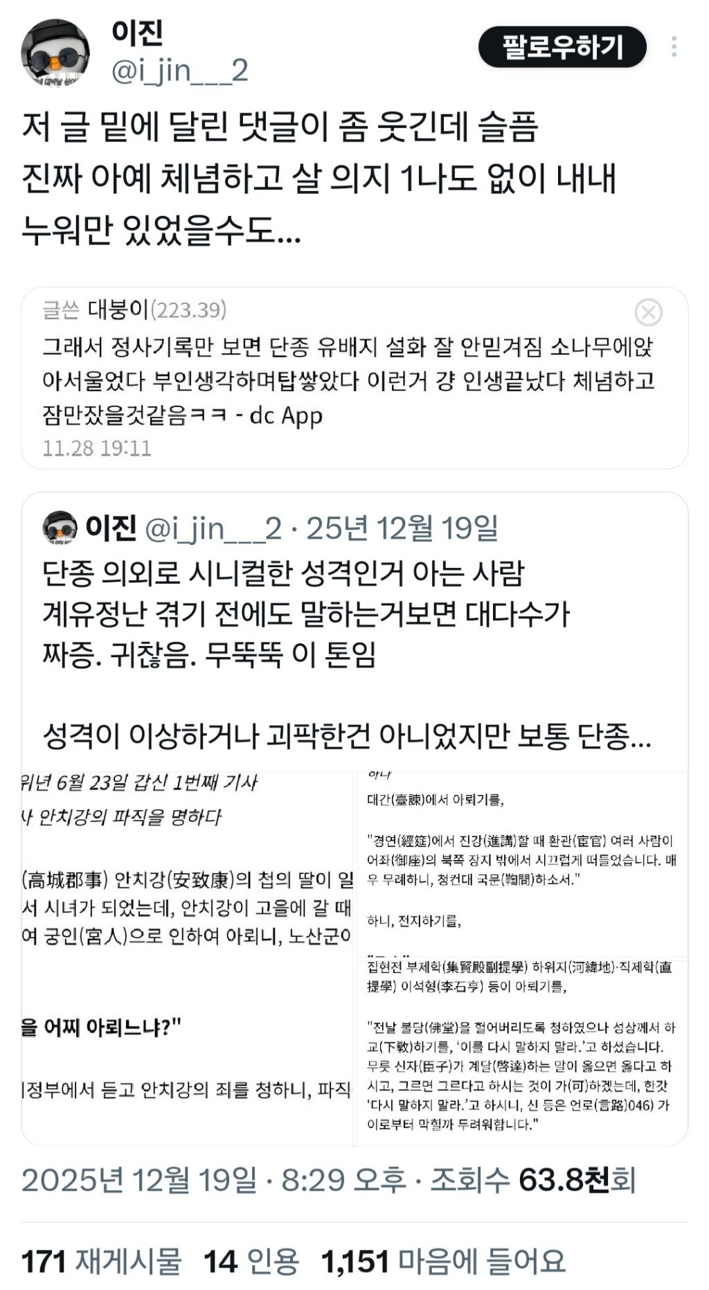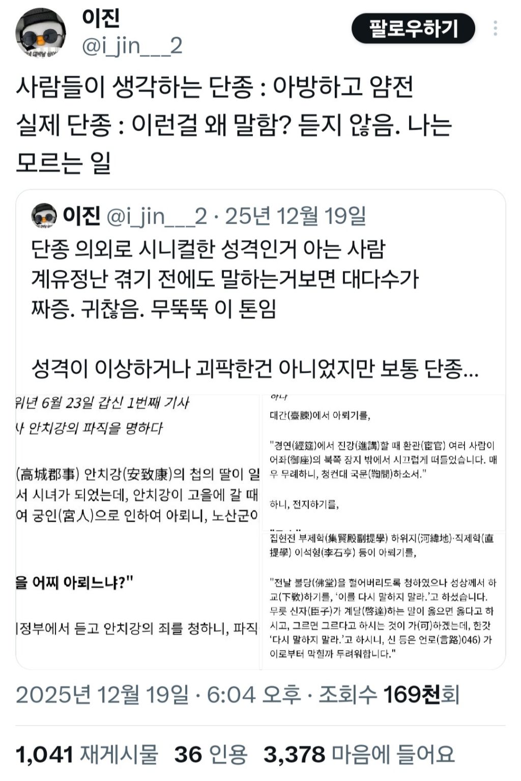작성자삔또 상한 강아지 작성시간 26.02.08 단종 나이생각하면 사춘기 쎄게온 청소년 아니냐고 ㅠㅠ