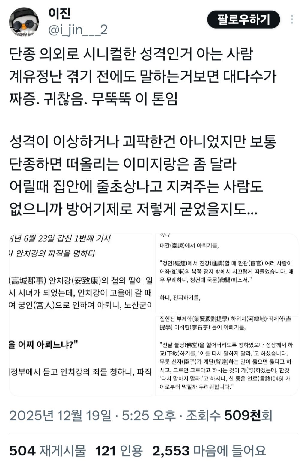 작성자Eeee00 작성시간 26.02.08 적통 중 적통이었으니까 그리고 어릴 때 세종도 엄청 이뻐하고 문종도 기존쎄였으니 본래 성격 + 분위기 받아 진짜 왕으로 컸을듯... 사냥도 엄청 좋아했다는데 단종이 왕으로서 통치했을 조선이 if도르로 계속 아쉬워지는거지 ㅜ.....