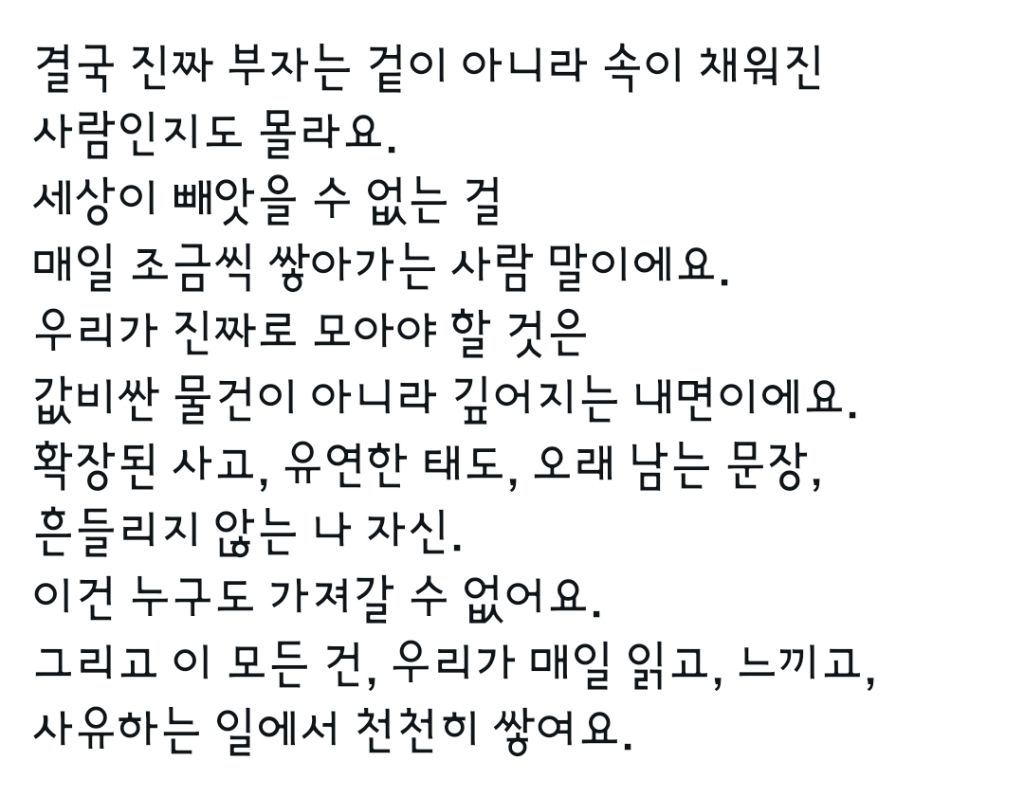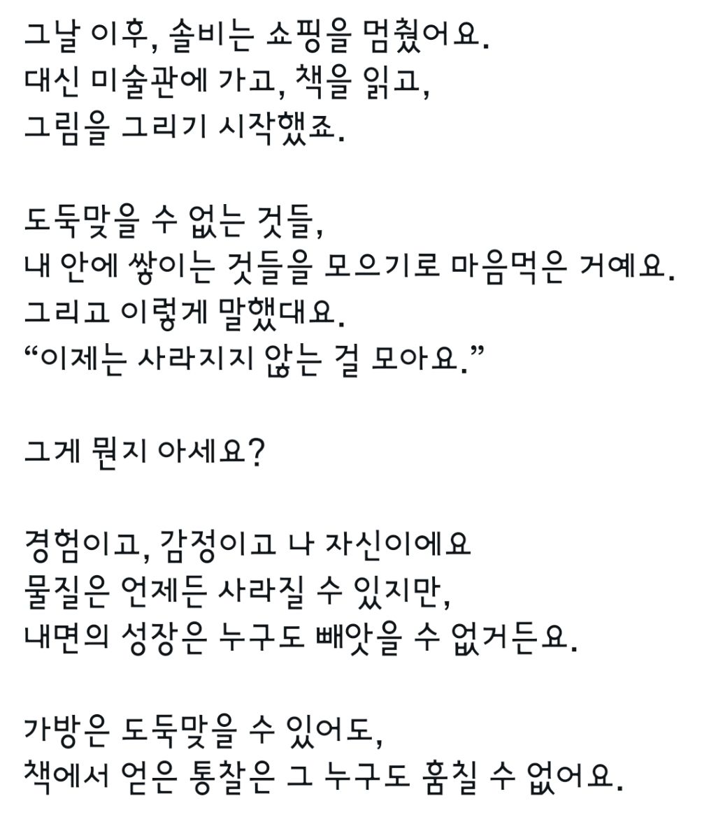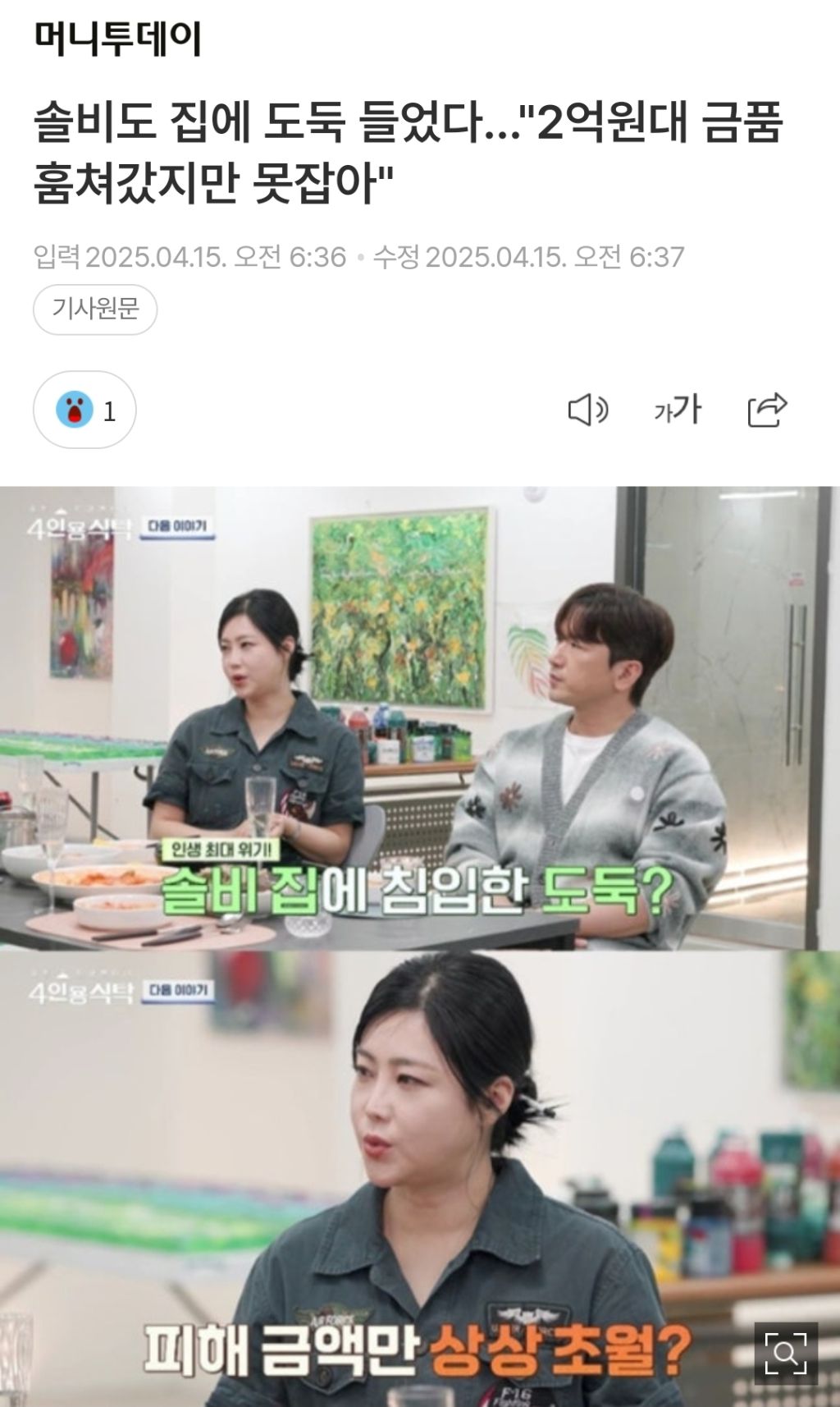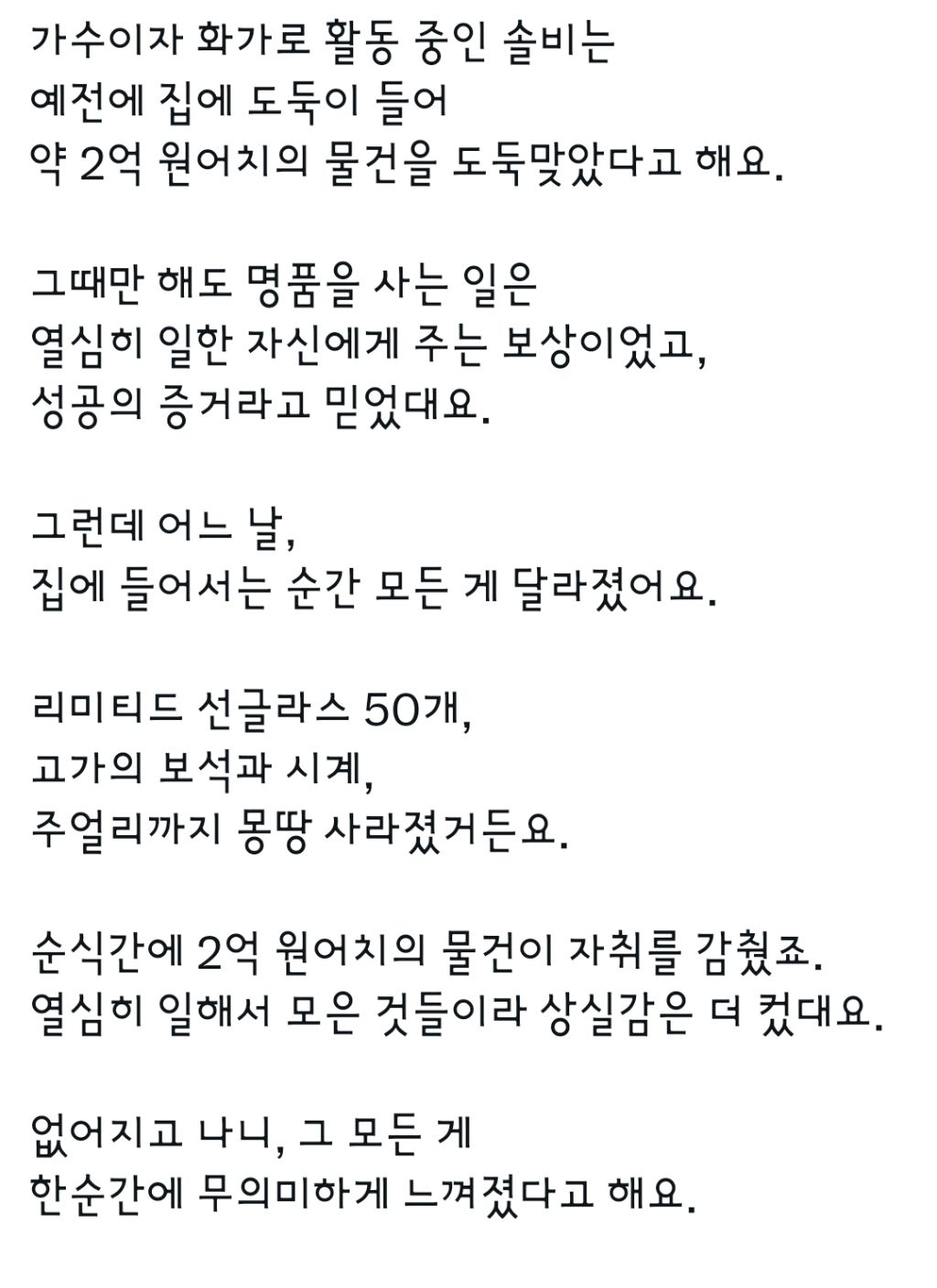[흥미돋]솔비가 쇼핑을 하지 않는 이유 작성자비오는 여름날|작성시간26.02.08|조회수69,082 목록 댓글 8 글자크기 작게가 글자크기 크게가 출처: https://x.com/i/status/2020140496874795116X의 더블와이파파님(@dyypapa)가수이자 화가로 활동 중인 솔비는 예전에 집에 도둑이 들어 약 2억 원어치의 물건을 도둑맞았다고 해요. 그때만 해도 명품을 사는 일은 열심히 일한 자신에게 주는 보상이었고, 성공의 증거라x.comhttps://youtube.com/shorts/Wax9xUCTi7U?si=c9X0Ce13s_6uevCihttps://naver.me/5XcdLkcR솔비도 집에 도둑 들었다…"2억원대 금품 훔쳐갔지만 못잡아"여기를 눌러 링크를 확인하세요m.entertain.naver.com 다음검색 현재 게시글 추가 기능 열기 북마크 공유하기 신고 센터로 신고 댓글 댓글 8 댓글쓰기 답글쓰기 댓글 리스트 작성자hello kitty | 작성시간 26.02.08 솔비 진짜 생각이 깊은 사람 같아 작성자다 잘될거야 힘내자 | 작성시간 26.02.08 와 너무 좋은 생각이다... 저걸 깨달은 것도 대단해 작성자햄버거좋아하는다이어터 | 작성시간 26.02.08 범인 못잡았나 작성자20151219 | 작성시간 26.02.08 헐 근데 나였으면 도둑새끼극ㄹ혐하면서 자물쇠만 졸라삿을거같은데 저런 생각한게진짜 대단하다.. 작성자xnxbwkq | 작성시간 26.02.08 굿 댓글 전체보기