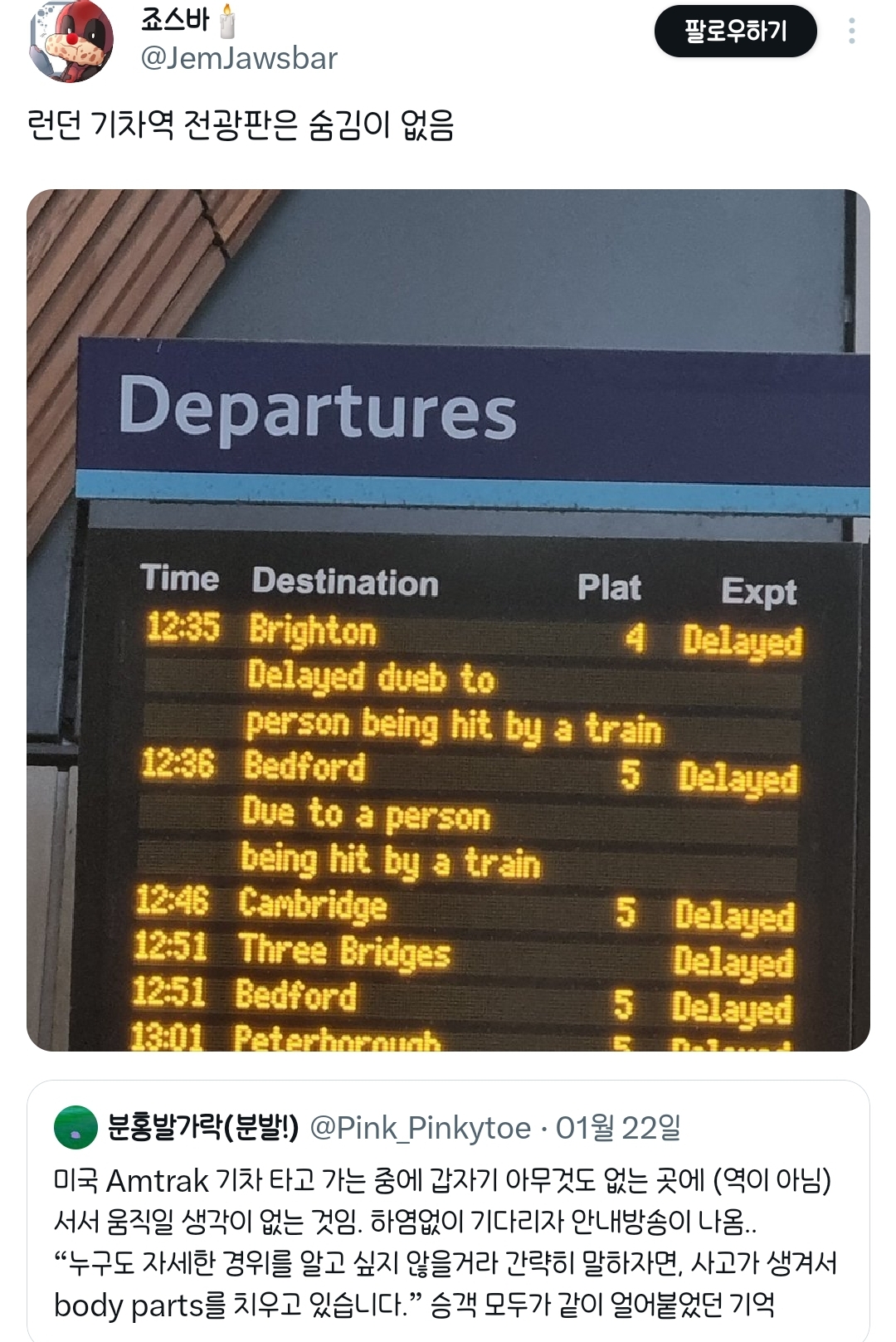 작성자고소한듀우 작성시간 26.02.08 amtrak 진짜 13시간도 기다려봄 누가 자살해서