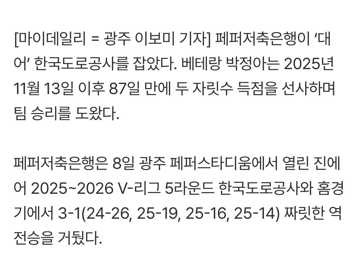 [여시뉴스데스크]박정아, 87일 만에 두 자릿수 득점 활약...페퍼, 선두 잡고 11승 채웠다 ‘팀 최다승 타이 기록’ [MD광주] 작성자슈퍼펭귄시리얼|작성시간26.02.08|조회수2,148 목록 댓글 8 글자크기 작게가 글자크기 크게가 출처: https://m.sports.naver.com/volleyball/article/117/0004033840박정아, 87일 만에 두 자릿수 득점 활약...페퍼, 선두 잡고 11승 채웠다 ‘팀 최다승 타이 기록’ [M여기를 눌러 링크를 확인하세요m.sports.naver.com 다음검색 현재 게시글 추가 기능 열기 북마크 공유하기 신고 센터로 신고 댓글 댓글 8 댓글쓰기 답글쓰기 댓글 리스트 작성자댕쩡이 | 작성시간 26.02.08 할수잇다 박정아아아아악 작성자환기시키자 | 작성시간 26.02.08 정아야ㅜㅜ 작성자CRYING NUT | 작성시간 26.02.08 오늘 페퍼 다잘함 ㄹㅇ 작성자박페퍼 | 작성시간 26.02.08 박정아 아랑해 작성자No.10 김연경 | 작성시간 26.02.08 짱정아ㅠㅠㅠㅠㅠ 댓글 전체보기