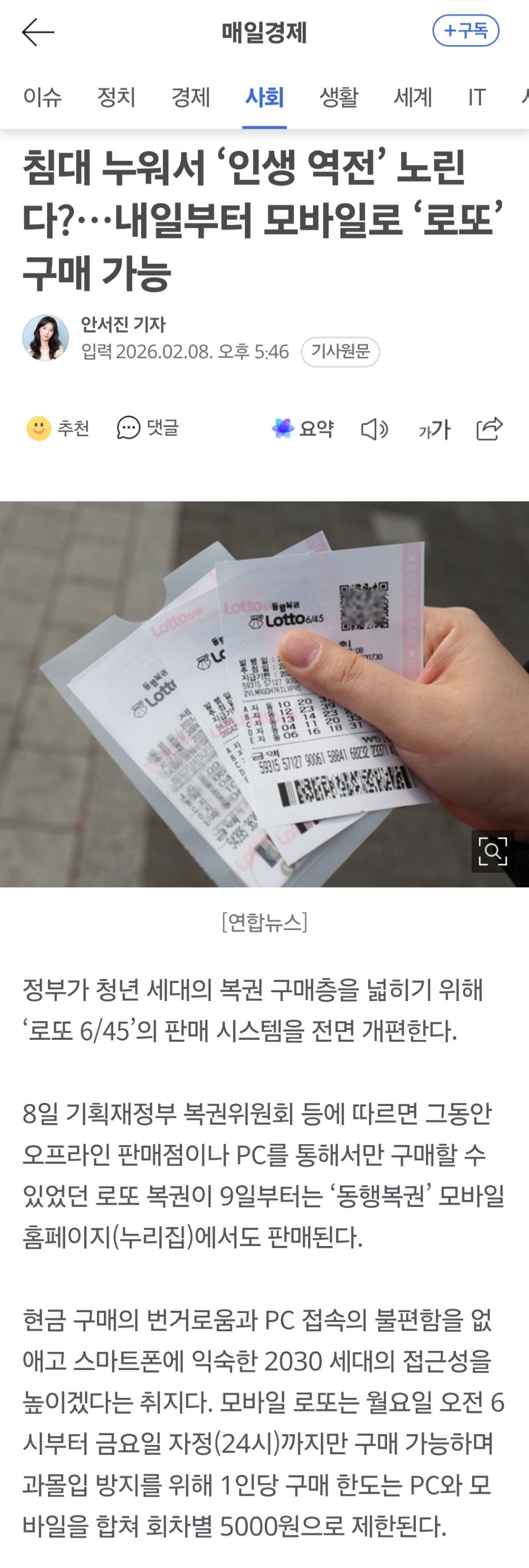 [여시뉴스데스크]침대 누워서 ‘인생 역전’ 노린다?…내일부터 모바일로 ‘로또’ 구매 가능 작성자오수정크리스탈|작성시간26.02.08|조회수19,637 목록 댓글 70 글자크기 작게가 글자크기 크게가 출처: https://naver.me/G5k51bTa침대 누워서 ‘인생 역전’ 노린다?…내일부터 모바일로 ‘로또’ 구매 가능정부가 청년 세대의 복권 구매층을 넓히기 위해 ‘로또 6/45’의 판매 시스템을 전면 개편한다. 8일 기획재정부 복권위원회 등에 따르면 그동안 오프라인 판매점이나 PC를 통해서만 구매할 수 있n.news.naver.com(9일 )월요일 오전 6시~금요일 24시까지 다음검색 현재 게시글 추가 기능 열기 북마크 공유하기 신고 센터로 신고 댓글 댓글 70 댓글쓰기 답글쓰기 댓글 리스트 작성자움파룸파파아 | 작성시간 26.02.08 오처넌은 너무적지않어? 만원은 해줘.. 작성자이구역대왕 | 작성시간 26.02.08 오늘부터 로또 사기로 맘먹었는데 와우! 작성자놕놕놕 | 작성시간 26.02.08 첫 모바일 1등 당첨자 저세요. 작성자닉네임 수정해 주세요. | 작성시간 26.02.08 담주 폰으로 산 1등 나겠군 작성자귀신이 고칼로리라고? | 작성시간 26.02.09 복똑방(동행복권 공식 앱) 이렇게 뜨는 앱 맞아?? 댓글 전체보기