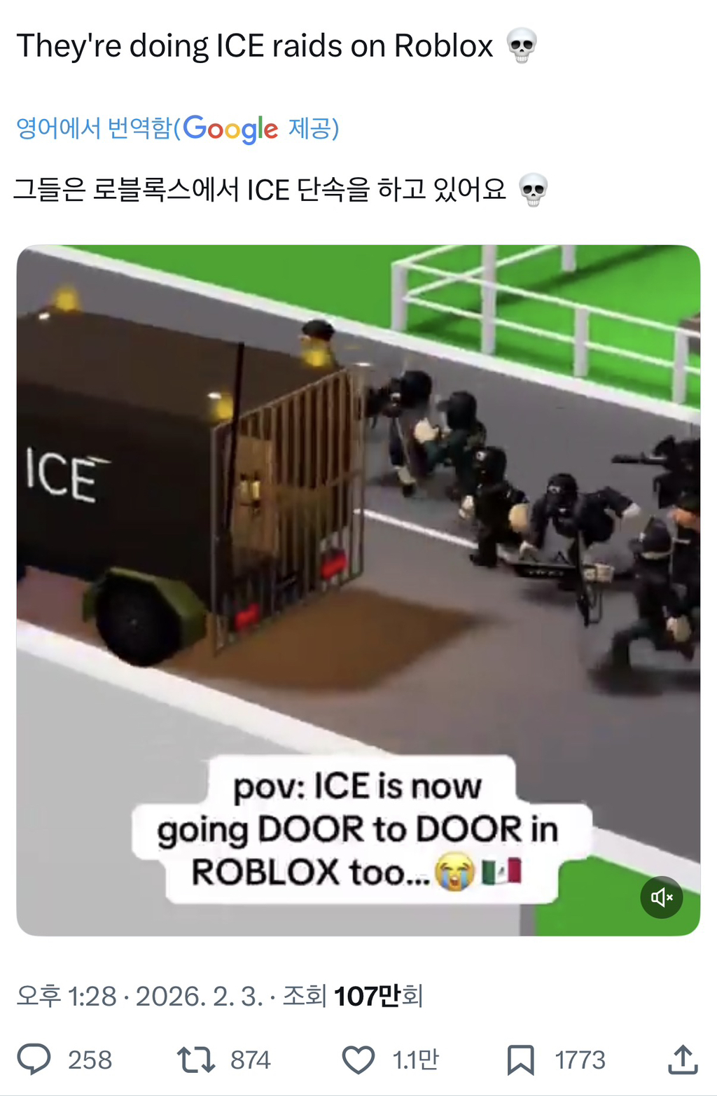 [흥미돋]ICE 단속 흉내내는 로블록스 계정들 작성자Rooose|작성시간26.02.08|조회수14,885 목록 댓글 1 글자크기 작게가 글자크기 크게가 출처: https://x.com/remarks/status/2018541988400820497?s=46&t=49r3Kw6TNqvpiTF8J4JDaA 다음검색 현재 게시글 추가 기능 열기 북마크 공유하기 신고 센터로 신고 댓글 댓글 1 댓글쓰기 답글쓰기 댓글 리스트 작성자스피또띠아 | 작성시간 26.02.08 우리나라 극우들도 애들 데리고 저기에서 반정부시위하던데 미국도 똑같구나 댓글 전체보기
