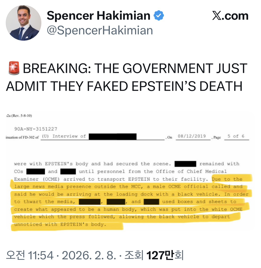 [흥미돋]방금 미국 정부가 제프리 앱스타인의 시체는 조작이었다고 인정함(죽은 건 맞으나 가짜 시신으로 위장) 작성자TOTOTO|작성시간26.02.08|조회수73,968 목록 댓글 247 글자크기 작게가 글자크기 크게가 출처: https://x.com/spencerhakimian/status/2020330488666485072?s=46X의 Spencer Hakimian님(@SpencerHakimian)🚨BREAKING: THE GOVERNMENT JUST ADMIT THEY FAKED EPSTEIN’S DEATHx.com 다음검색 현재 게시글 추가 기능 열기 북마크 공유하기 신고 센터로 신고 댓글 댓글 247 댓글쓰기 답글쓰기 댓글 리스트 작성자그래도내가낫지 | 작성시간 26.02.10 머냐.. 작성자4/4 11:22 | 작성시간 26.02.10 먼소리야;;;; 작성자알아서햐라 | 작성시간 26.02.10 인정한게 웃기다 저러면 지금 다 파헤치는 것중에 절반은 ㄹㅇ맞을 수도 있다는거잖아 그게 더 소름끼침ㅅㅂ;; 작성자칼국수좋다구 | 작성시간 26.02.11 저거랑 코모양 다른건 설명이 안되는데상자와 시트로 얼굴은 못만들잖아 작성자귀뚜라미귀뚜라미 | 작성시간 26.02.14 와 댓글 전체보기