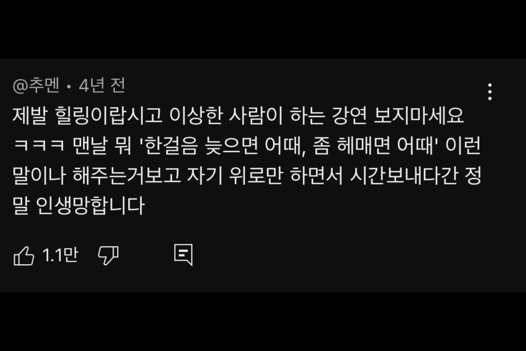 작성자아포칼립스에 물류센터를 숨김 작성시간 26.02.09 나도 그런 강연 굳이 찾아보는거 이해는 안되지만 그렇다고 인생이 망하고 어쩌고 하는건 웃기는 일이고 해외여행 결격 사유 있는 인생이 아닌 이상 망한 인생은 없다 생각함