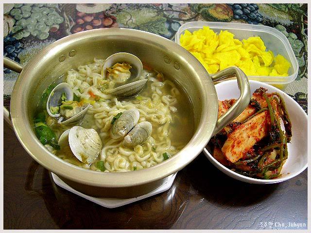 농심 멸치칼국수~ 청량고추와 모시조개를 넣고 끓였는데 국물맛이 정말 좋았습니다