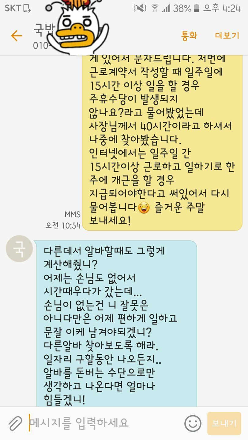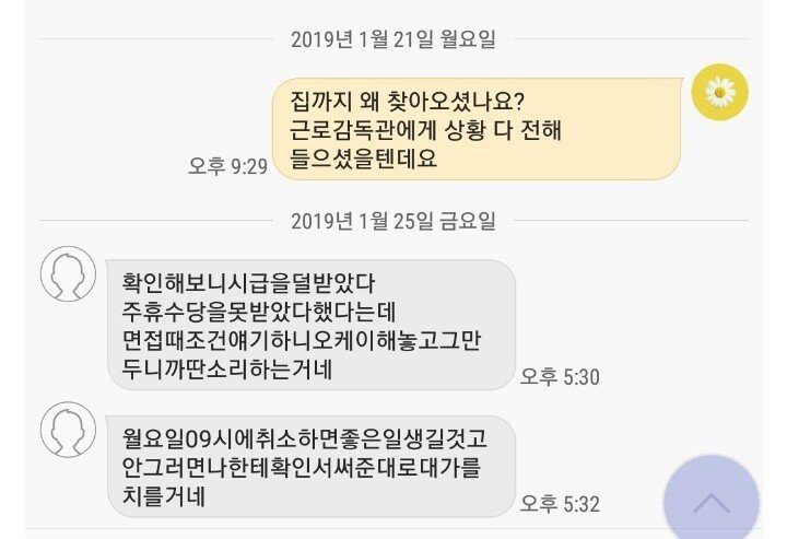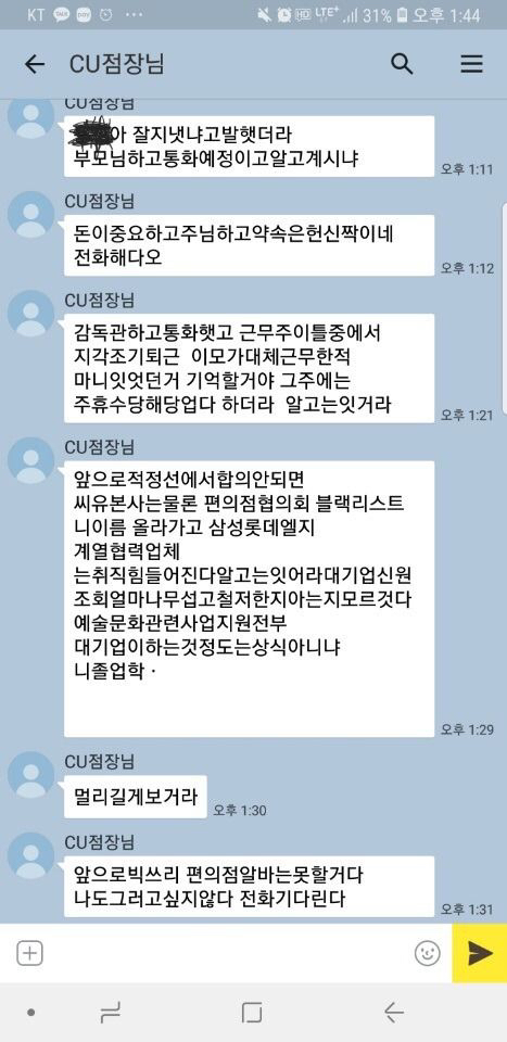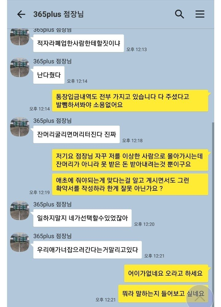 [스크랩] [기타]주휴수당 달라고 하면 일어나는 일...jpg 작성자정동남|작성시간26.02.09|조회수66,568 목록 댓글 30 글자크기 작게가 글자크기 크게가 출처 : 여성시대 머쓱타드"취소 안하면 대가를 치를거네""잔머리 굴리면 머리 터진다 진짜""우리애가 너 잡으러간다는거 말리고 있다"..."알바를 돈 버는 수단으로만 생각하고 나온다면 얼마나 힘들겠니!" 다음검색 스크랩 원문 : *여성시대* 차분한 20대들의 알흠다운 공간 현재 게시글 추가 기능 열기 북마크 공유하기 신고 센터로 신고 댓글 댓글 30 댓글쓰기 답글쓰기 댓글 리스트 작성자늙남만나지마제발제발 | 작성시간 26.02.09 끽해야 편의점하면서 꼴같잖게 대기업 취업을 운운하고 있어 ㅋㅋㅋㅋㅋㅋ 작성자김리즈 | 작성시간 26.02.09 역ㄱ겹다 ㄷㄷ 작성자레츠고양이 | 작성시간 26.02.09 미친소리 작성자시공의균열 | 작성시간 26.02.09 빅쓰리 편의점ㅅㅂㅋㅋㅋㅋㅋㅋ 작성자sjkukseee | 작성시간 26.02.09 빅쓰리 편의점 알밬ㅋㅋㅋㅋㅋㅋㅋㅋㅋ 녜녜,,, 댓글 전체보기