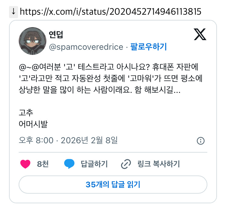 [흥미돋]여러분 '고' 테스트라고 아시나요? 휴대폰 자판에 '고'라고만 적고 자동완성 첫줄에 '고마워'가 뜨면 평소에 상냥한 말을 많이 하는 작성자We’re going up up|작성시간26.02.09|조회수39,045 목록 댓글 1,298 글자크기 작게가 글자크기 크게가 출처: https://x.com/i/status/2020452714946113815 다음검색 현재 게시글 추가 기능 열기 북마크 공유하기 신고 센터로 신고 댓글 댓글 1,298 댓글쓰기 답글쓰기 댓글 리스트 작성자박보람 | 작성시간 26.02.10 고마워 작성자푸바오오오옹 | 작성시간 26.02.11 고르기 ? 작성자최복복 | 작성시간 26.02.13 광화문 작성자가을야구 | 작성시간 26.02.19 고구마... 작성자기꺼이 돌아가며 마음껏 헤매자 | 작성시간 26.03.04 고마웡 댓글 전체보기