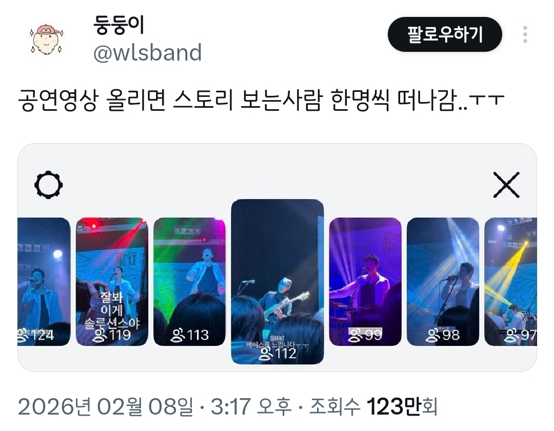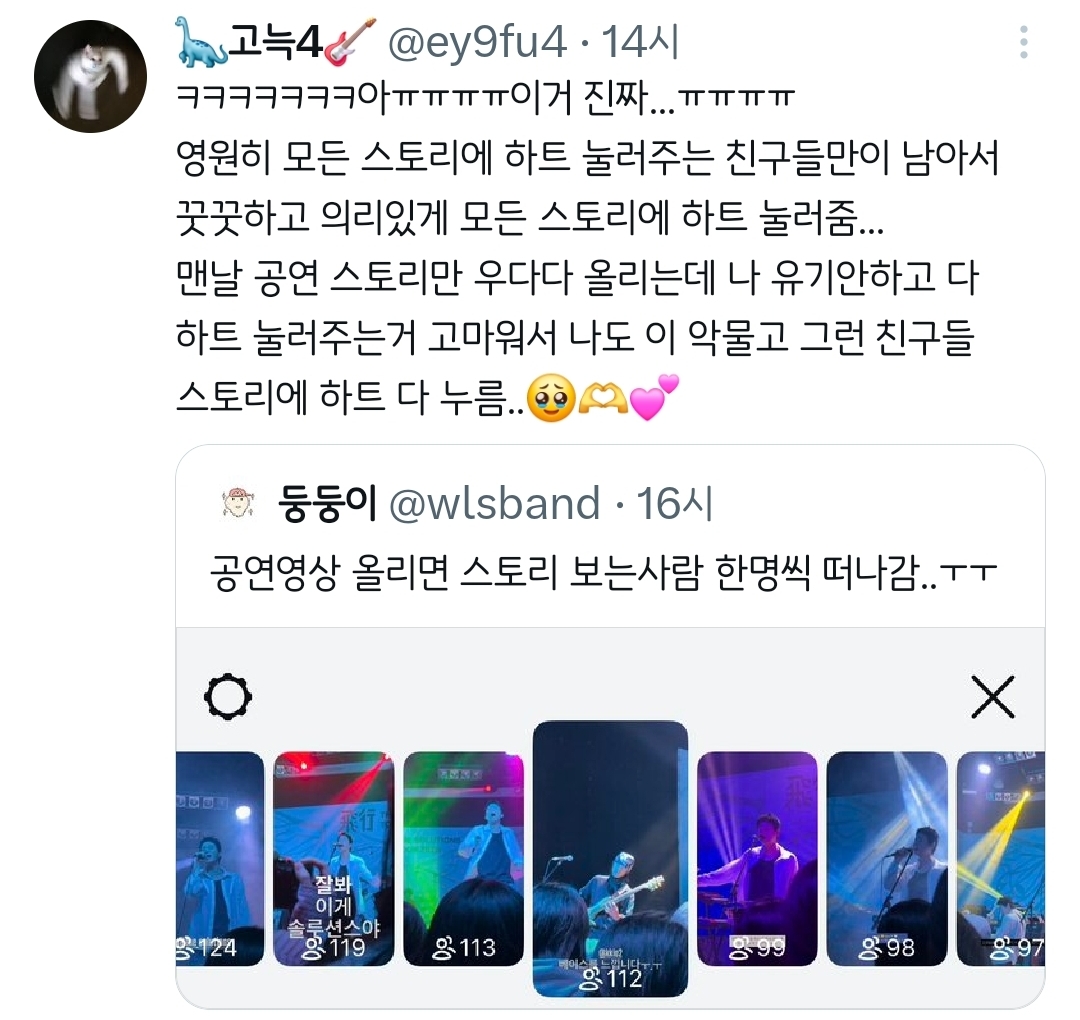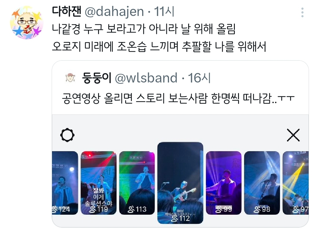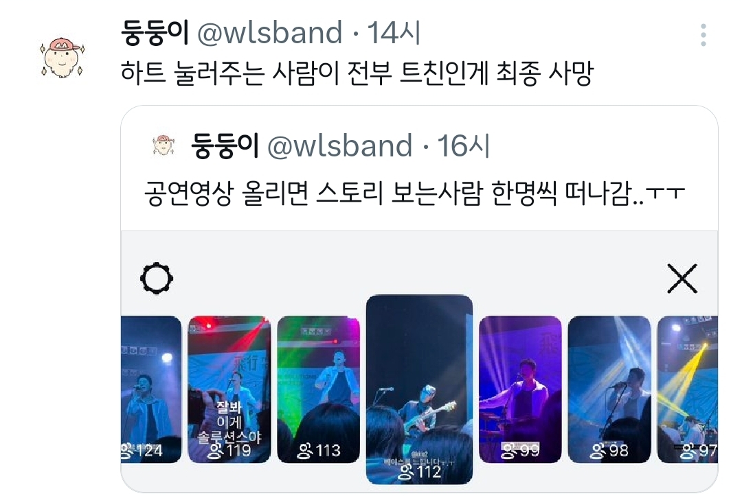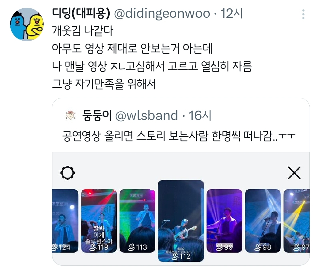 [흥미돋]공연영상 올리면 스토리 보는사람 한명씩 떠나감..ㅜㅜ.twt 작성자치킨바냐나|작성시간26.02.09|조회수45,593 목록 댓글 45 글자크기 작게가 글자크기 크게가 출처: 여성시대 치킨바냐나https://x.com/i/status/2020381428715053484X의 둥둥이님(@wlsband)공연영상 올리면 스토리 보는사람 한명씩 떠나감..ㅜㅜx.com🥹🫶💕 다음검색 현재 게시글 추가 기능 열기 북마크 공유하기 신고 센터로 신고 댓글 댓글 45 댓글쓰기 답글쓰기 댓글 리스트 작성자파란나라를보았지 | 작성시간 26.02.09 ㅋㅋㅋㅋㅋㅋㅋㅋㅋ 작성자큼흠흠 | 작성시간 26.02.09 나도 나중에 내가 간략하게 보려고 올림 ㅋㅋㅋㅋ 작성자멋쟁이고구마 | 작성시간 26.02.09 아니 모아놨다가 내가 보려고 올린다구요ㅠㅋㅋㅋㅋㅋㅋㅋㅋㅋㅋ 작성자냥구르 | 작성시간 26.02.09 ㅁㅈㅋㅋㅋㅋㅋㅋㅋㅋ 작성자REACT | 작성시간 26.02.09 그냥 내 기록용이지ㅋㅋㅋㅋ 그나저나 저 분 솔루션스 공연다녀오셨구나 부럽다 댓글 전체보기