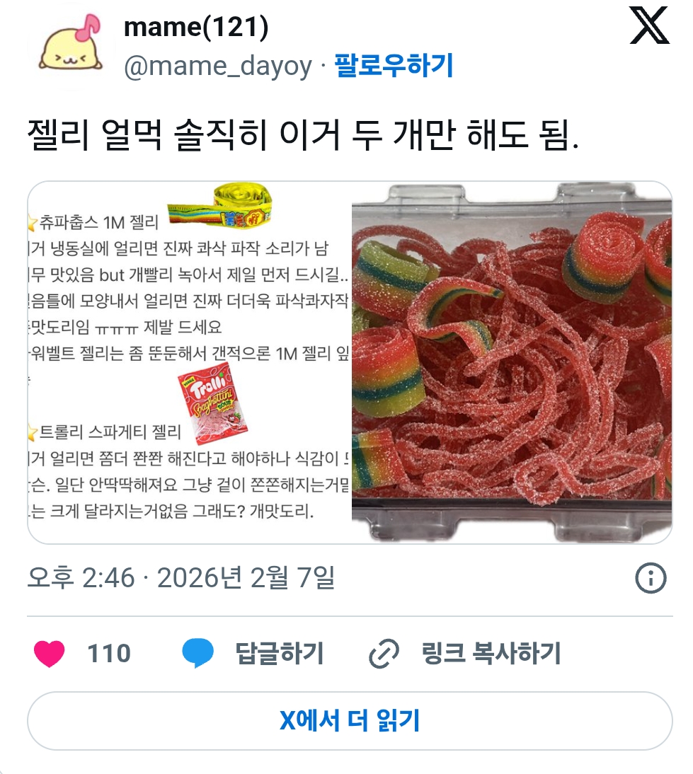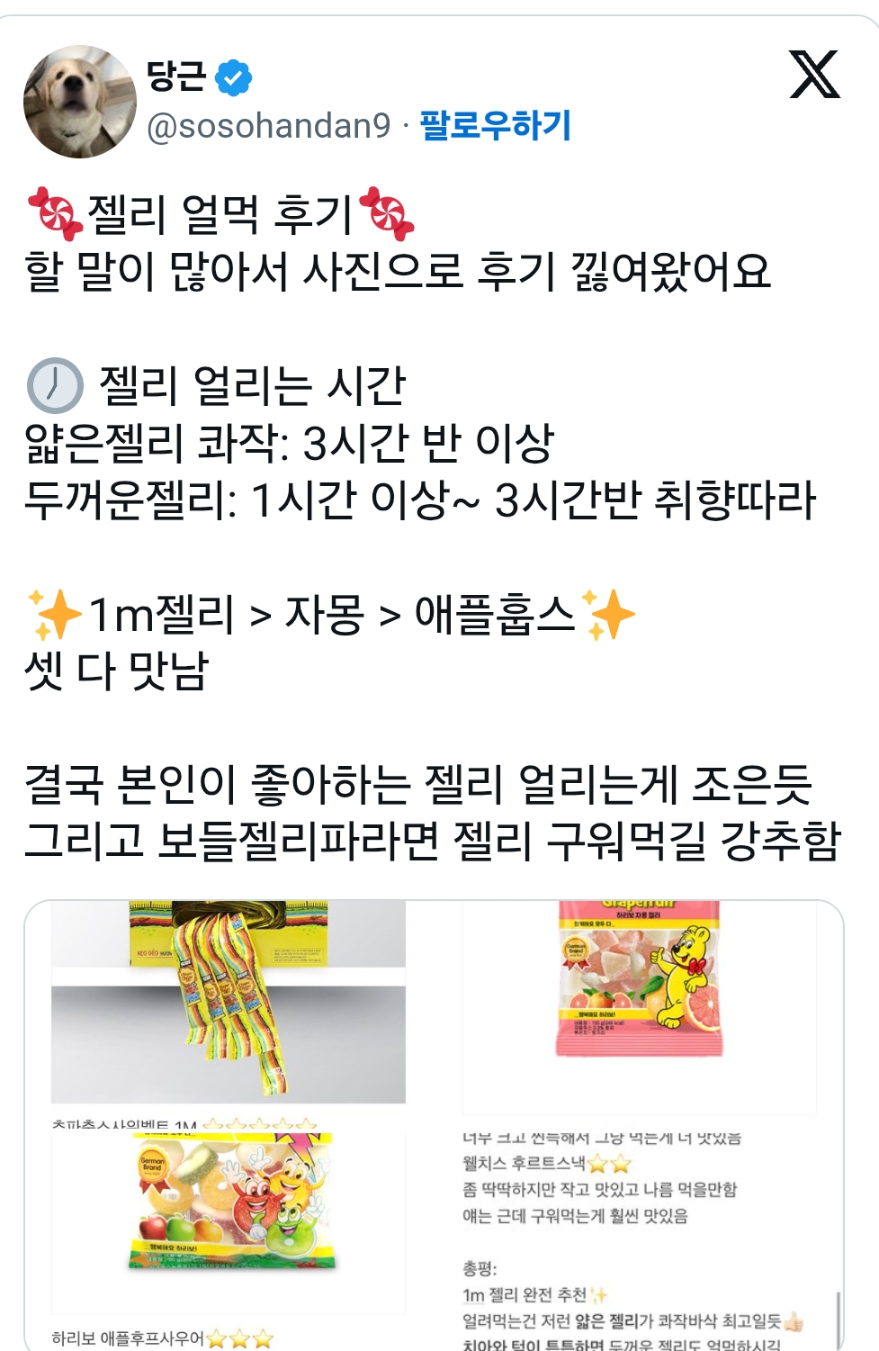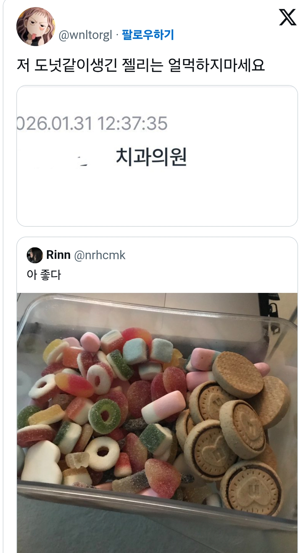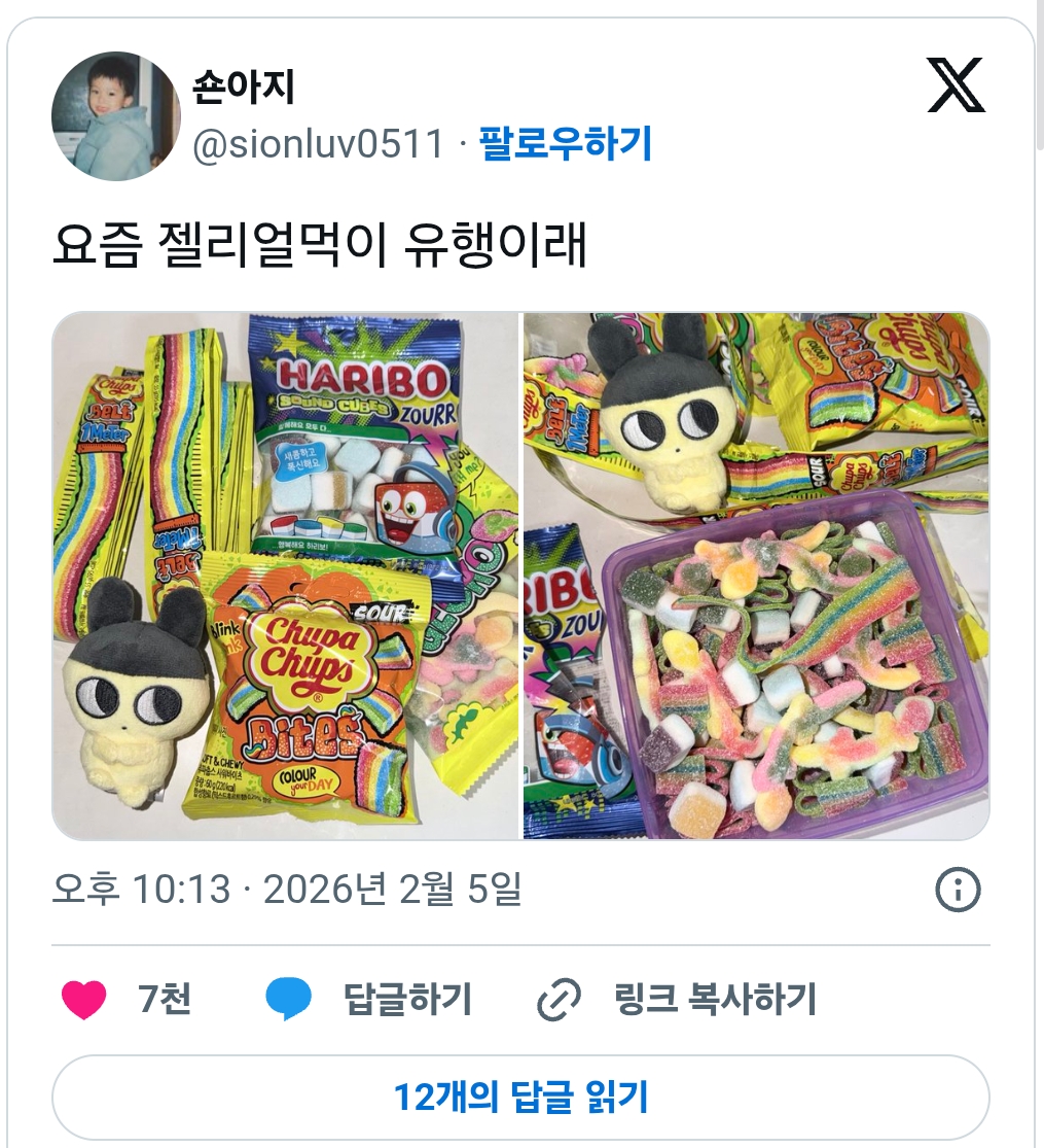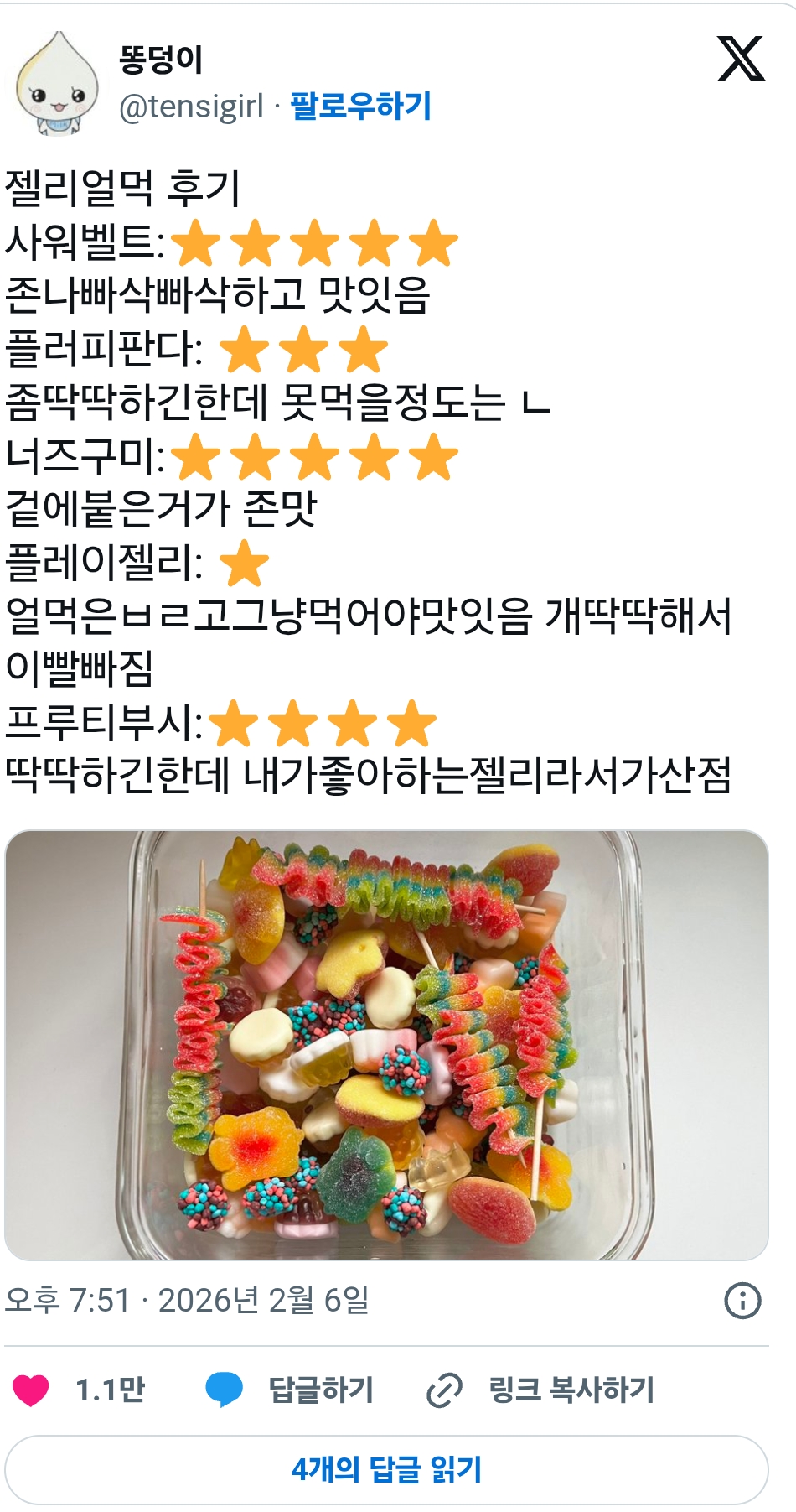 작성자주먹밥짱 작성시간 26.02.10 아 뚱쭝한 젤리밖에 없는데 ㅜ