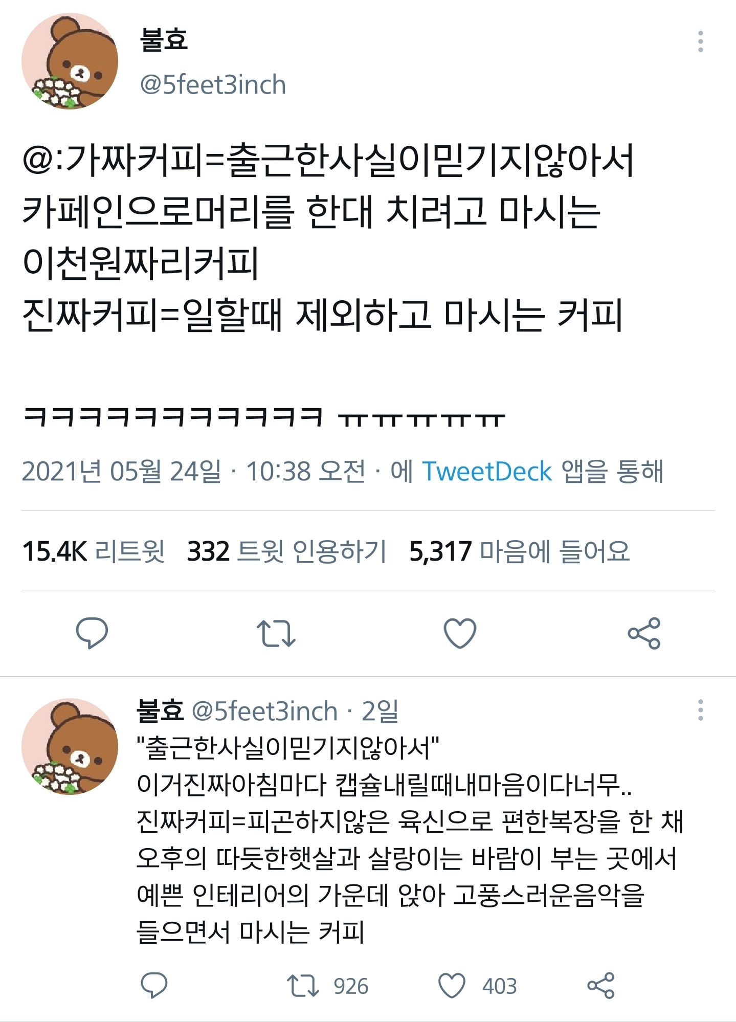 [스크랩] [흥미돋]직장인들의 진짜커피와 가짜커피.twt 작성자Tory-|작성시간26.02.09|조회수18,026 목록 댓글 7 글자크기 작게가 글자크기 크게가 출처 : 여성시대 은해(원출처: https://twitter.com/5feet3inch/status/1396641703323332610?s=19 )같은 커피인데 맛도 다름 다음검색 스크랩 원문 : *여성시대* 차분한 20대들의 알흠다운 공간 현재 게시글 추가 기능 열기 북마크 공유하기 신고 센터로 신고 댓글 댓글 7 댓글쓰기 답글쓰기 댓글 리스트 작성자말티추 | 작성시간 26.02.09 아 ㅈㄴ 웃겨 작성자멕그로우 | 작성시간 26.02.09 ㅋㅋㅋㅋ진짜ㅠ 근무중 점심시간에 샌드위치같은거 먹다가 목막혀서 콸콸마시는 가짜커피가 있으요 작성자구라즐 | 작성시간 26.02.09 카페인 예민해서 주말이라도 안 마시려고 하는데 행복이 사라짐....ㅋㅋㅋ ㅠㅠㅠㅠ 작성자띠깅이리뤼 | 작성시간 26.02.09 ㅠㅠㅠ웃퍼 작성자내 꿈은 돈 많은 백수 | 작성시간 26.02.09 ㄹㅇ 댓글 전체보기