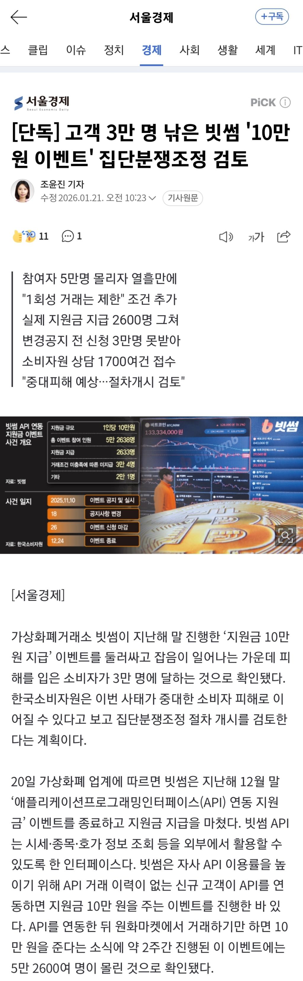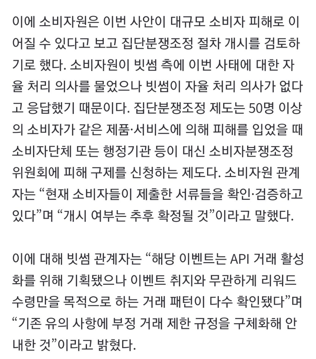 [여시뉴스데스크][단독] 고객 3만 명 낚은 빗썸 '10만원 이벤트' 집단분쟁조정 검토 작성자회계뿌셔뿌셔|작성시간26.02.09|조회수5,265 목록 댓글 3 글자크기 작게가 글자크기 크게가 출처: https://n.news.naver.com/article/011/0004581003?sid=101[단독] 고객 3만 명 낚은 빗썸 '10만원 이벤트' 집단분쟁조정 검토가상화폐거래소 빗썸이 지난해 말 진행한 ‘지원금 10만 원 지급’ 이벤트를 둘러싸고 잡음이 일어나는 가운데 피해를 입은 소비자가 3만 명에 달하는 것으로 확인됐다. 한국소비자원은 이번 사n.news.naver.com중략 다음검색 현재 게시글 추가 기능 열기 북마크 공유하기 신고 센터로 신고 댓글 댓글 3 댓글쓰기 답글쓰기 댓글 리스트 작성자철이네분식 | 작성시간 26.02.09 비트오지급에 이거까지 업보빔 받아라 작성자웃고싶어존버 | 작성시간 26.02.09 나도 저거 민원넣어서 간신히 받았는데^^ 싀바 작성자아카나 와일드프레이리 | 작성시간 26.02.09 감다뒤로 모델 정우성 데려온뒤로 안 썼는데 잡음 진짜 심하네 그런 할배 데려와서 광고비 쓰지말고 이벤트로 나눠주세요 이벤에서 사기치고 할배 모델비 주고 있네 댓글 전체보기