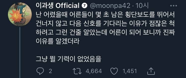 [스크랩] [흥미돋]어른들은 왜 신호등 앞에서 뛰질 않아? 작성자Night|작성시간26.02.09|조회수28,853 목록 댓글 55 글자크기 작게가 글자크기 크게가 출처: 여성시대 설리야https://theqoo.net/square/3240702971더쿠 - 어른들은 왜 신호등 앞에서 뛰질 않아?여기를 눌러 링크를 확인하세요theqoo.net 다음검색 스크랩 원문 : *여성시대* 차분한 20대들의 알흠다운 공간 현재 게시글 추가 기능 열기 북마크 공유하기 신고 센터로 신고 댓글 댓글 55 댓글쓰기 답글쓰기 댓글 리스트 작성자구릿빛머스마 | 작성시간 26.02.09 뛰다가 넘어져서 양쪽무릎 박살난적 있는 후로 걍 걸어…. 작성자어쩌달 | 작성시간 26.02.09 숨차. 작성자엔스누피 | 작성시간 26.02.09 무릎나가욥 작성자대디오 | 작성시간 26.02.09 힘들어 작성자로또딩첨제발요 | 작성시간 26.02.09 뛸 힘이 없어.. 댓글 전체보기