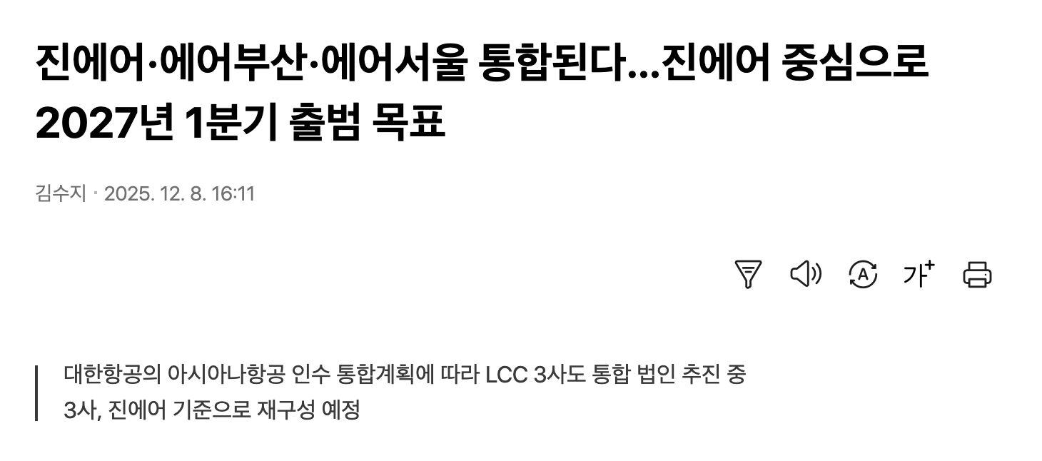 대한항공에선 2027년 1분기안에 인천에 거점을 두고 (진에어로 에어부산, 에어서울이 흡수됨)하나의 LCC로 합병할 계획
