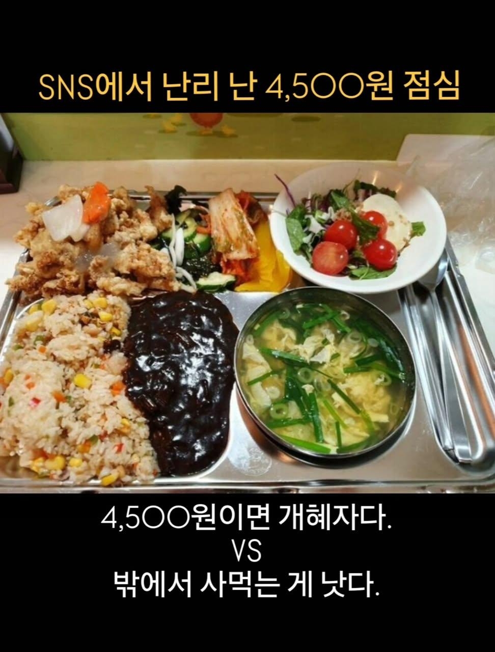 [흥미돋]SNS에서 난리 난 4,500원 구내식당 점심 작성자여단오여|작성시간26.02.09|조회수79,222 목록 댓글 325 글자크기 작게가 글자크기 크게가 출처: 여성시대 여단오여 1.4,500원이면 개혜자다.VS2.밖에서 사먹는 게 낫다.3.와개혜자지 이걸 밖에서 어떻게 이 돈 주고 사 먹어??????구내식당 인 듯 한데...어딜까??2번 한 여시들 뭐라그러는거 아니고어디서 뭘 사먹었는지 꼭 알려주기야 다음검색 현재 게시글 추가 기능 열기 북마크 공유하기 신고 센터로 신고 댓글 댓글 325 댓글쓰기 답글쓰기 댓글 리스트 작성자호놀룰루이 | 작성시간 26.02.10 8천원에도 저렇게 안나옴... 작성자겨울귤 | 작성시간 26.02.10 밖에서사먹으면 볶음밥만 8,9천원... 작성자행복한부자가될사람 | 작성시간 26.02.10 1 작성자마라연금술사 | 작성시간 26.02.13 3 작성자네모네모스판지밥 | 작성시간 26.02.13 헐 배고파졌어ㅜ 댓글 전체보기