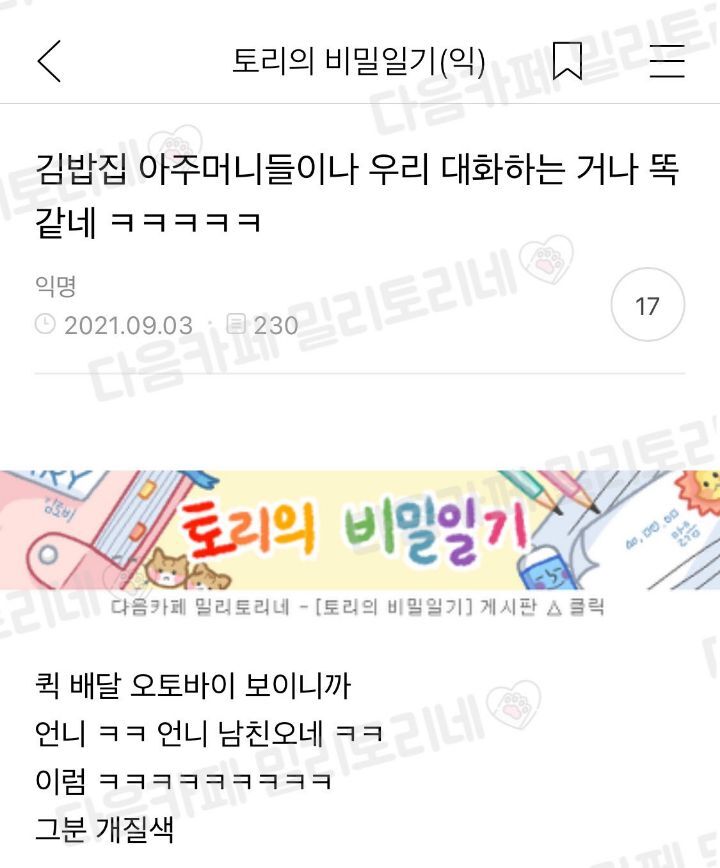[스크랩] [배꼽의행방]김밥집 아주머니들이나 우리 대화하는 거나 똑같네 작성자꺼지 세요 ㅠㅠ|작성시간26.02.09|조회수96,594 목록 댓글 38 글자크기 작게가 글자크기 크게가 출처 : https://twitter.com/milytoryfan/status/1437235005634199552?s=19 다음검색 스크랩 원문 : *여성시대* 차분한 20대들의 알흠다운 공간 현재 게시글 추가 기능 열기 북마크 공유하기 신고 센터로 신고 댓글 댓글 38 댓글쓰기 답글쓰기 댓글 리스트 작성자야구선수 홍민기 | 작성시간 26.02.09 저기 니 남친 지나간다~ 아 아니라고~!!! 작성자싸리빗자루 | 작성시간 26.02.09 이거냐고 ㅋㅋㅋㅋㅋㅋ 이미지 확대 작성자97jc | 작성시간 26.02.09 ㅋㅋㅋㅋㅋㅋㅋㅋㅋㅋㅋㅋㅋㅋㅋㅋㅋㅋㅋㅋㅋㅋㅋㅋㅋㅋㅋㅋㅋㅋㅋㅋㅋㅋㅋㅋㅋㅋㅋㅋㅋㅋㅋㅋㅋㅋㅋㅋㅋㅋㅋㅋㅋㅋㅋㅋㅋㅋㅋㅋㅋㅋ 작성자비비디 바비디부 | 작성시간 26.02.09 미칮ㅋㅊㅋㅋㅋㅋㅋㅋㅋㅋㅋㅋㅋㅋ 작성자헤그리 | 작성시간 26.02.09 ㅋㅋㅋ 댓글 전체보기