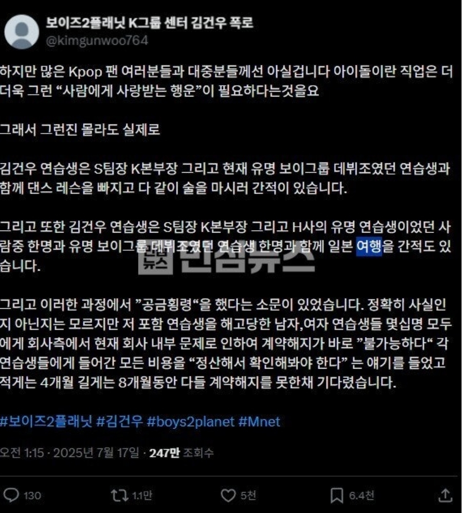 그리고 또한 김건우 연습생은 S팀장 K본부장 그리고 H사의 유명 연습생이었던 사람중 한명과 유명 보이그룹 데뷔조였던 연습생 한명과 함께 일본 여행을 간적도 있습니다.