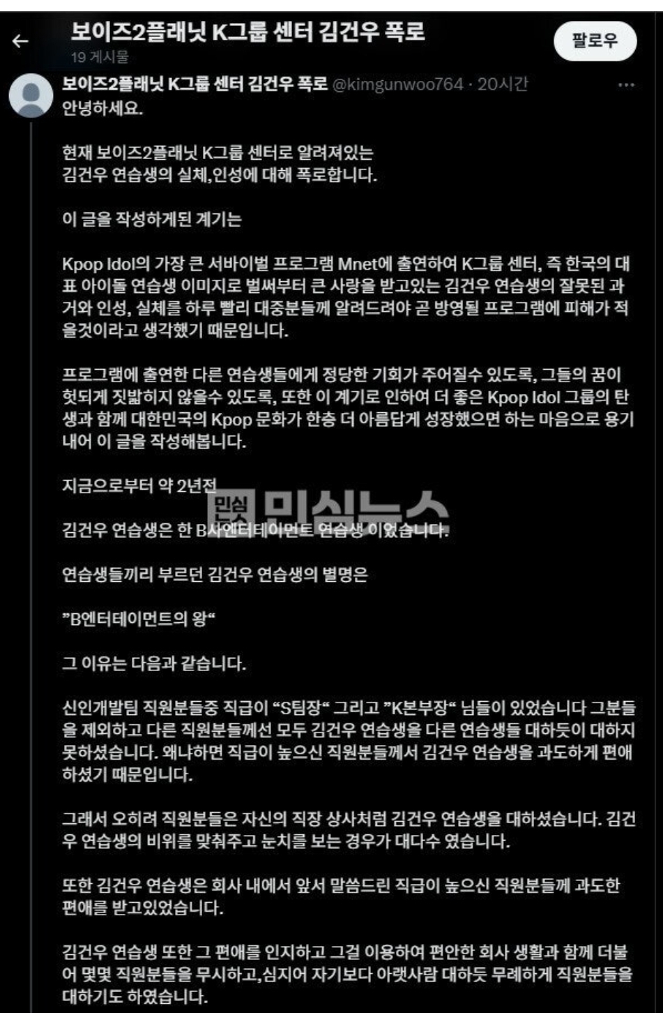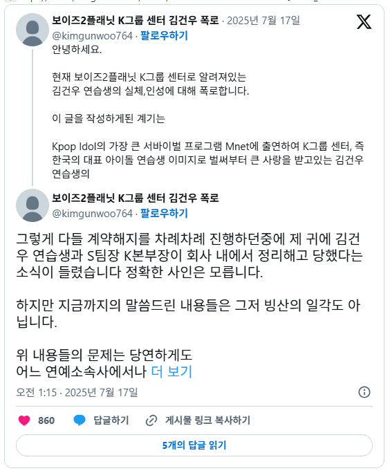 Kpop Idol의 가장 큰 서바이벌 프로그램 Mnet에 출연하여 K그룹 센터, 즉 한국의 대표 아이돌 연습생 이미지로 벌써부터 큰 사랑을 받고있는 김건우 연습생의 잘못된 과거와 인성, 실체를 하루 빨리 대중분들께 알려드려야 곧 방영될 프로그램에 피해가 적을것이라고 생각했기 때문입니다.