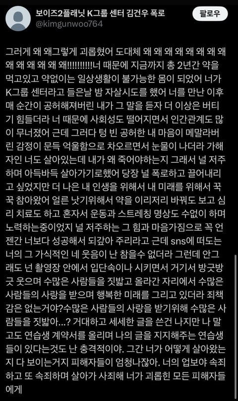 그 스트레스가 계속 쌓여갔고 그래서 저희도 살기위해 이 원인을 완만히 해결하고자 김건우 연습생이 저희에게 했던 일들을 하나하나 세세하게 글로 작성해서 본부장님을 찾아갔지만 본부장님은 저희가 써온것들을 그대로 무시해버리시면서