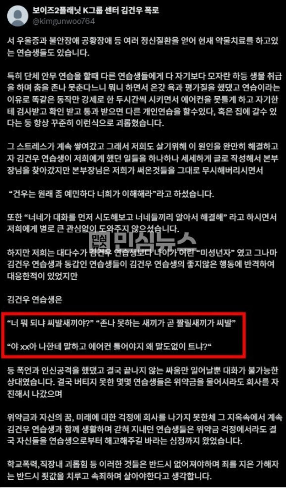 하지만 저희는 대다수가 김건우 연습생보다 나이가 어린 “미성년자” 였고 그나마 김건우 연습생과 동갑인 연습생들이 김건우 연습생의 좋지않은 행동에 반격하여 대응한적이 있었지만