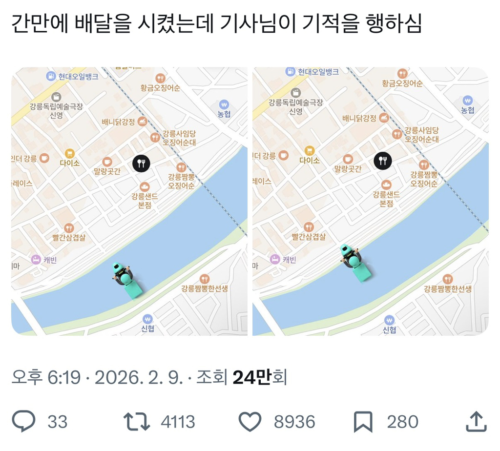 [흥미돋]기적을 행사한 배민 기사 작성자Rooose|작성시간26.02.09|조회수62,386 목록 댓글 38 글자크기 작게가 글자크기 크게가 출처: https://x.com/lexifdev/status/2020789673560330427?s=46&t=49r3Kw6TNqvpiTF8J4JDaA 다음검색 현재 게시글 추가 기능 열기 북마크 공유하기 신고 센터로 신고 댓글 댓글 38 댓글쓰기 답글쓰기 댓글 리스트 작성자바다와 행복 | 작성시간 26.02.10 서울아니네 작성자안녕허손요 | 작성시간 26.02.10 딸렐루야 작성자나는로또1등반박없음 | 작성시간 26.02.10 샹ㅋㅋㅋㅋ 댓글들 도랏나 개웃겨 ㅋㅋㅋ 작성자집에 가지마 | 작성시간 26.02.10 베드로야 내가 물위를 작성자그릴드치즈 | 작성시간 26.02.10 수륙양용오도바이 ㄷㄷ 댓글 전체보기