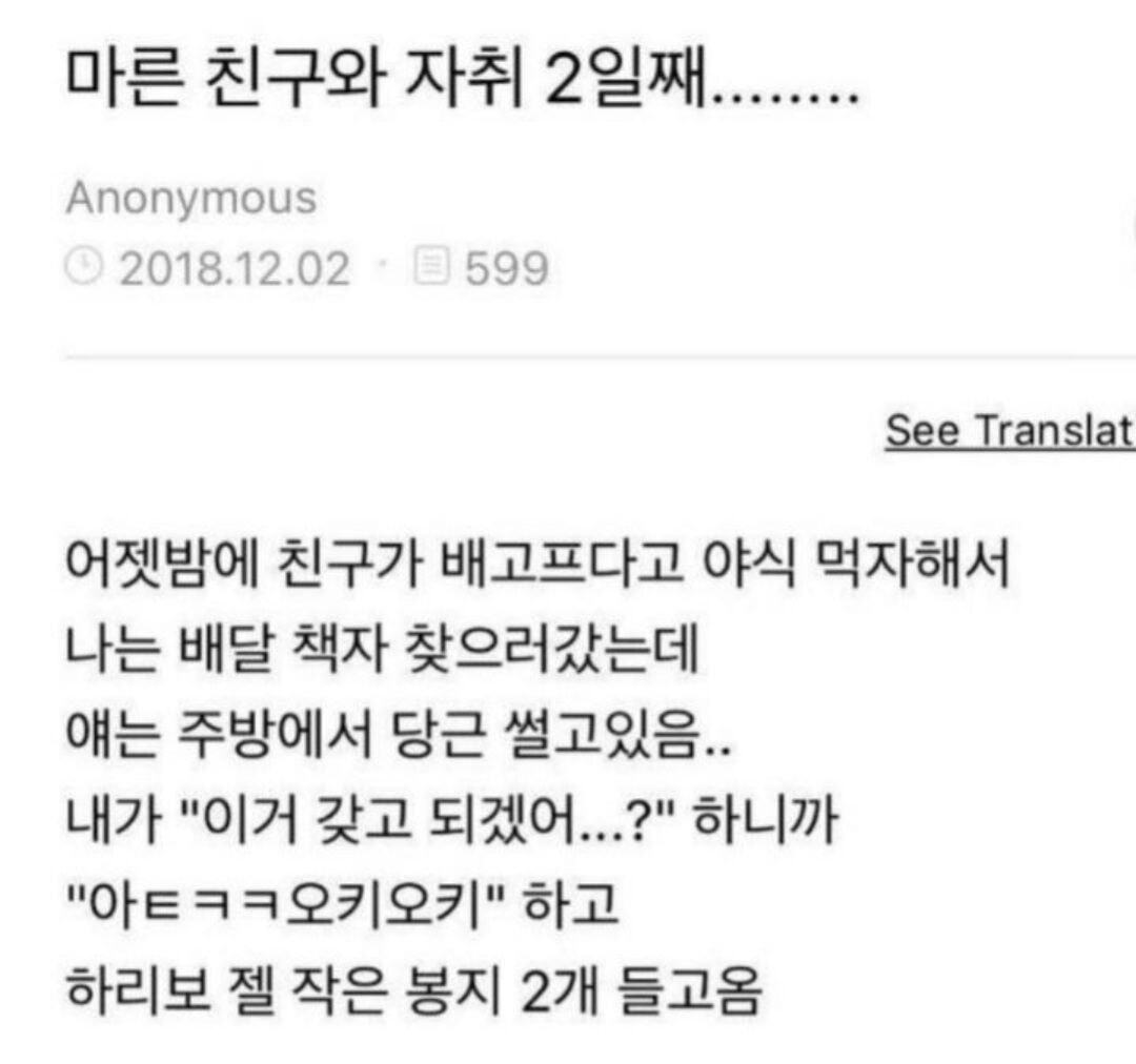 작성자뭐우짜라고 작성시간 26.02.09 친구집 놀러갔는데 아 출출해 하더니 냉장고 열어서 메추리알 한개 먹고 냉장고 닫더라..ㅎ