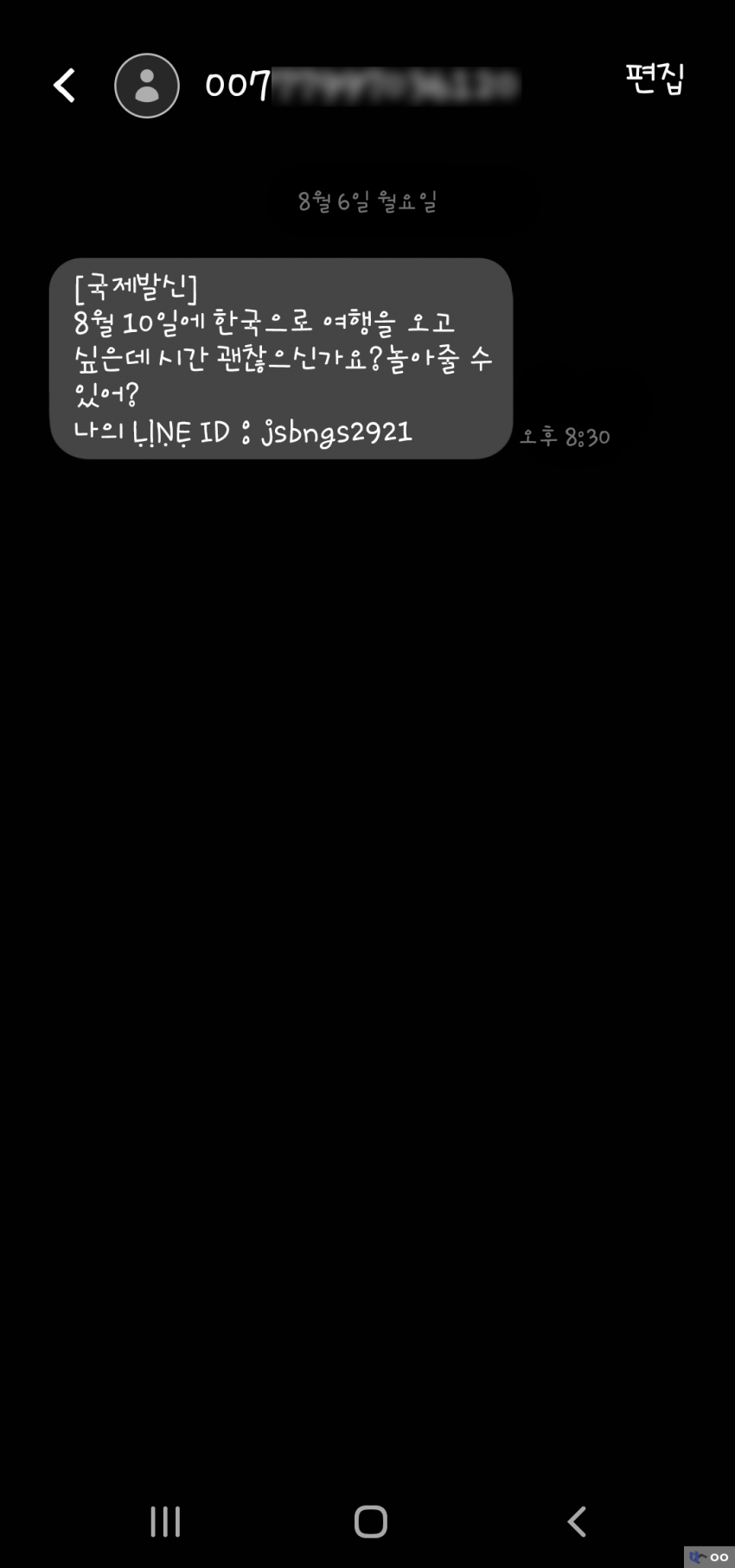 방금 수신한 문자메시지는 문 앞에서 발송되었습니다.