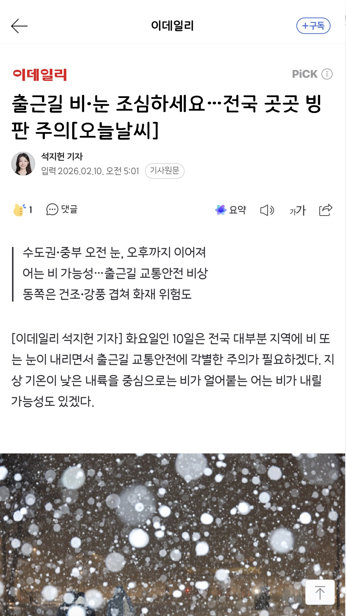 [여시뉴스데스크]출근길 비·눈 조심하세요…전국 곳곳 빙판 주의[오늘날씨] 작성자Siri..|작성시간26.02.10|조회수5,737 목록 댓글 4 글자크기 작게가 글자크기 크게가 출처: https://n.news.naver.com/article/018/0006216226?sid=103전문 출처로 다음검색 현재 게시글 추가 기능 열기 북마크 공유하기 신고 센터로 신고 댓글 댓글 4 댓글쓰기 답글쓰기 댓글 리스트 작성자쁘띠뽀빠뜨루 | 작성시간 26.02.10 오 오늘 D지게 더운디 작성자올리오피칸테 | 작성시간 26.02.10 퇴근길이 아니고?ㅎㅎ 작성자중앙 | 작성시간 26.02.10 하늘 꼬라지가 눈비 처오게 생김 ㅡㅡ 작성자멍멍냠냠홍시 | 작성시간 26.02.10 오는시간 계속 밀리는디 오지마라 댓글 전체보기