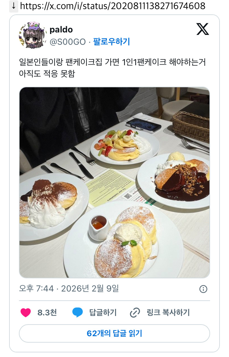 작성자술친자 작성시간 26.02.10 나도 쉐어하는건 별로 안 좋아하는데 1인1수플레가 정석인데도 세덩이씩 주는게 신기하다ㅋㅋㅋㅋㅋㅋㅋㅋㅋ 넘 많지않나 쟤네는 우리보다 소식하잖아
