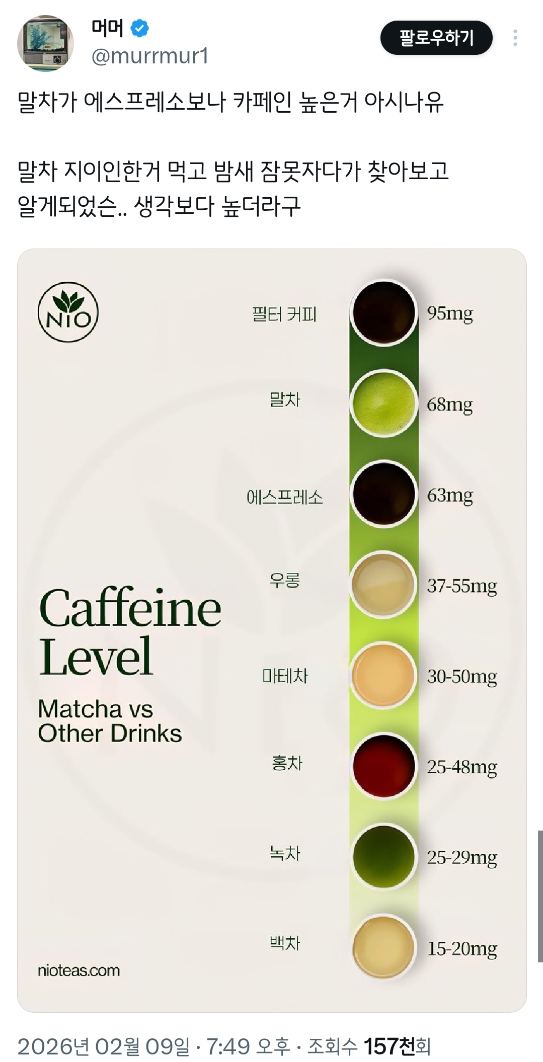 [흥미돋]말차가 에스프레소보다 카페인 높은거 아시나유.twt 작성자치킨바냐나|작성시간26.02.10|조회수10,500 목록 댓글 49 글자크기 작게가 글자크기 크게가 출처: 여성시대 치킨바냐나https://x.com/i/status/2020812201540411621X의 머머님(@murrmur1)말차가 에스프레소보나 카페인 높은거 아시나유 말차 지이인한거 먹고 밤새 잠못자다가 찾아보고 알게되었슨.. 생각보다 높더라구x.com우롱은 뭐야 어쩐지 우롱 밀크티 마시고 잠을 못 잠 다음검색 현재 게시글 추가 기능 열기 북마크 공유하기 신고 센터로 신고 댓글 댓글 49 댓글쓰기 답글쓰기 댓글 리스트 작성자부산콘서트홀 | 작성시간 26.02.10 나는 카모마일이랑 국화랑 메리골드 작성자부산콘서트홀 | 작성시간 26.02.10 근데 말차 흡수가 안되서 ? 인지 잠잘와 커피보다 작성자말카 | 작성시간 26.02.10 공차 밀크티도 홍차 아니여? 100mg넘던데 나 진짜 먹고 기절하는 줄 … 다른거같아…. 스벅 말차먹어도 아무렇지 않았어 작성자갓생의해 | 작성시간 26.02.10 근데 차는 마셔도 잠 잘오더라 신기해 작성자김소름 | 작성시간 26.02.10 엥이제 말차를 먹어야겠다 댓글 전체보기